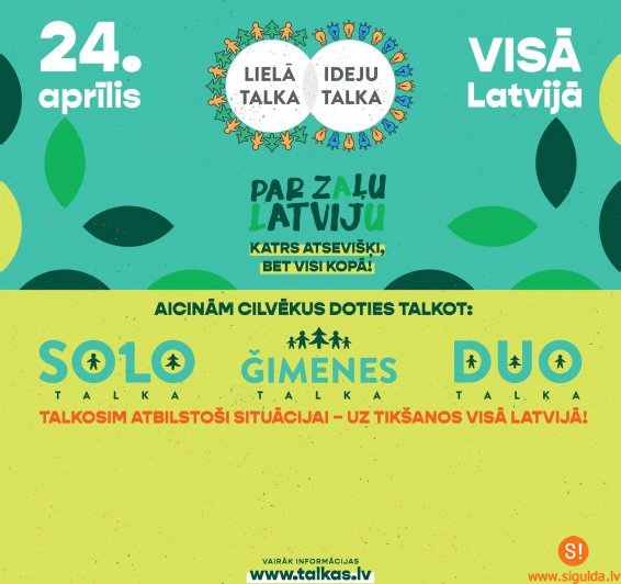Šogad Lielās talkas vadmotīvs ir “Par zaļu Latviju – katrs atsevišķi, bet visi kopā”, jo ikviens no mums var piedalīties un palīdzēt Latvijai kļūt par zaļāko un tīrāko valsti pasaulē. Papildu informācija pieejama tīmekļa vietnē www.talkas.lv.