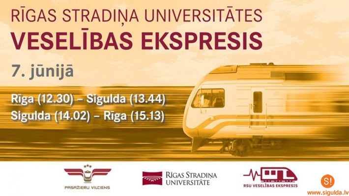 Piektdien, 7. jūnijā, maršrutā Rīga–Sigulda–Rīga dosies Rīgas Stradiņa universitātes (RSU) un AS „Pasažieru vilciens” rīkotais Veselības ekspresis. Šoreiz RSU un RSU Sarkanā Krusta medicīnas koledžas māszinību studenti informēs pasažierus par dažādu slimību riskiem, bezmaksas veselības pārbaudēm, kā arī mērīs asinsspiedienu, ķermeņa masas indeksu, skābekļa daudzumu asinīs, stresa un miegainības līmeni.