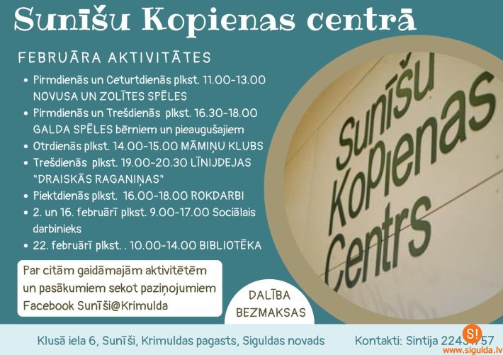 Februārī Sunīšu Kopienas centrā norisināsies dažādas aktivitātes gan lieliem, gan maziem – spēļu vakari, rokdarbu pulciņš un dejas. Iedzīvotāji tiek aicināti iesaistīties aktivitāšu organizēšanā un paust savas idejas par tās saturu.