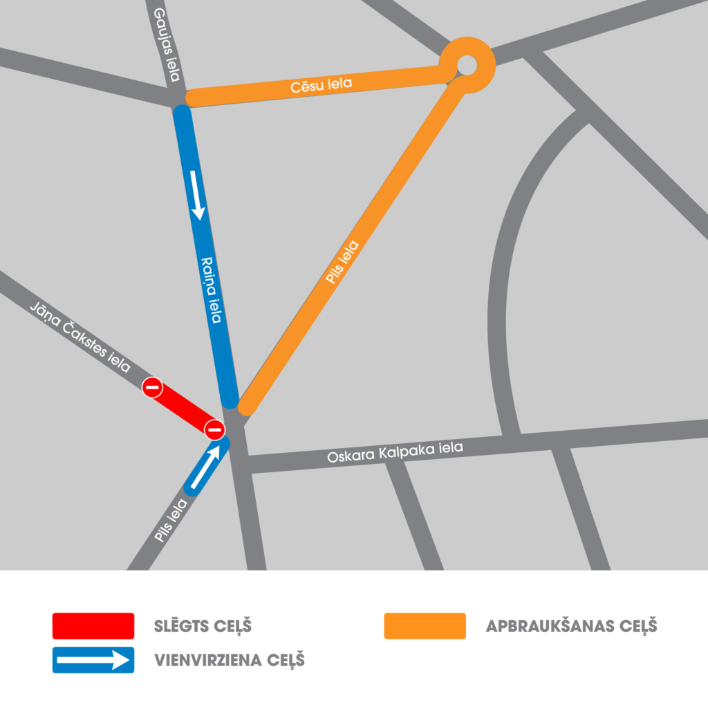 - Raiņa, Pils, Jāņa Čakstes un Oskara Kalpaka ielas krustojumā sāksies rotācijas apļa izbūve. Jāņa Čakstes ielas posms pie krustojuma ar Pils ielu būs slēgts. Pils ielā, zonā pie Jāņa Čakstes ielas, satiksmes tiks organizēta vienā virzienā.