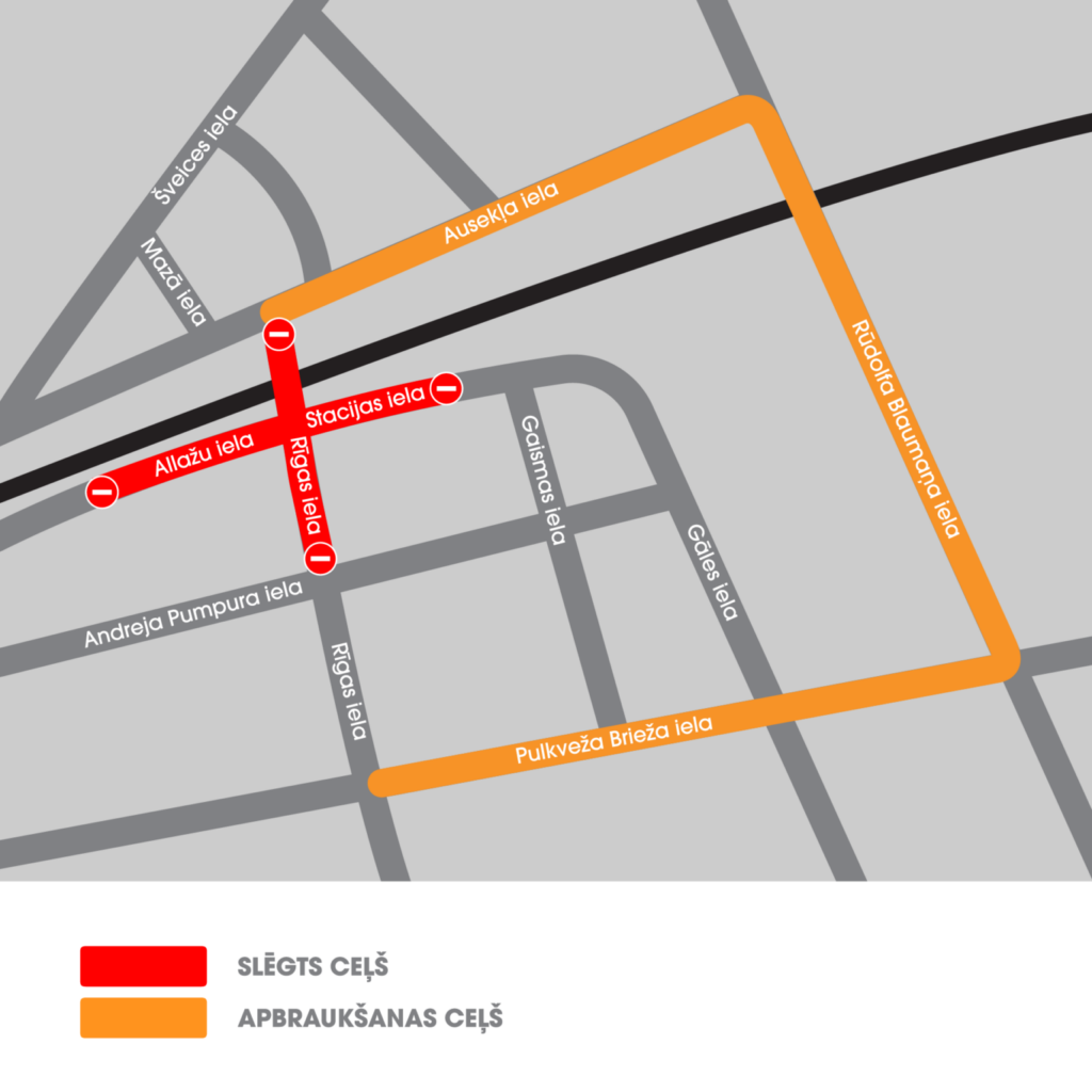 - Rīgas ielā sāksies darbi dzelzceļa pārbrauktuves zonā, pārbrauktuve uz Rīgas ielas tiks slēgta, satiksmes organizācijas izmaiņas būs arī ielu posmos pie pārbrauktuves. Slēgtā posma apbraukšana pa Pulkveža Brieža un Blaumaņa ielu. Gājēju kustība šajā posmā nebūs ierobežota.