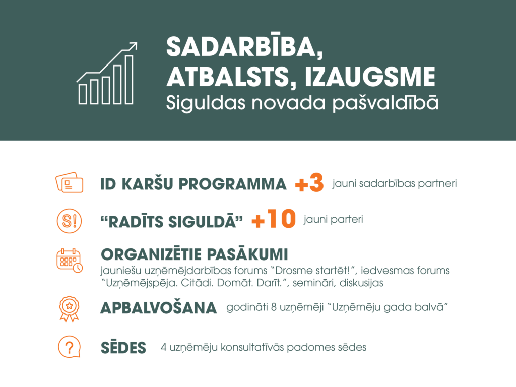 Siguldas novada pašvaldība 2025. gadā īstenojusi vairākas aktivitātes, kuru mērķis ir veidot sadarbību ar novada uzņēmējiem un investoriem, informēt par aktuālo, kā arī sniegt atbalstu un motivēt jaunos uzņēmējus.