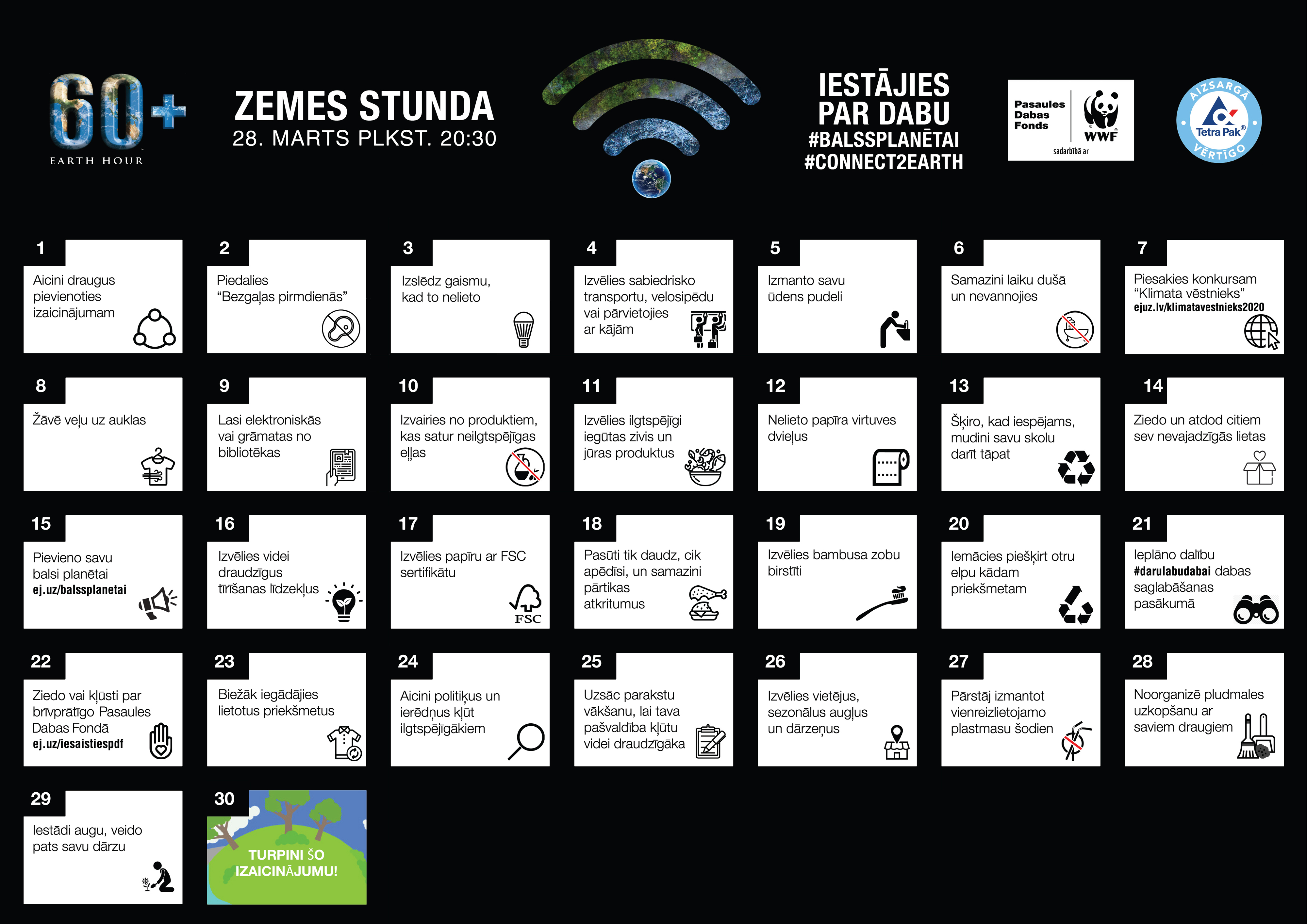 Siguldas novada pašvaldība jau vairākus gadus iesaistās Zemes stundas akcijā, kas norisinās visā pasaulē. Turpinot iesākto akciju #satiecsevi, ikviens iedzīvotājs aicināts piedalīties, uz stundu izslēdzot mājās gaismu, un atbalstīt atbildīgu dzīvesveidu, sekojot videi draudzībām idejām. Šogad Zemes stunda norisināsies 28. martā plkst. 20.30, kuras laikā tiks atslēgts āra apgaismojums vairākās pašvaldības iestādēs un pilsētas ielās. Novadnieki aicināti arī turpmāk piedomāt pie saviem ikdienas paradumiem, piedaloties 30 dienu izaicinājumā.