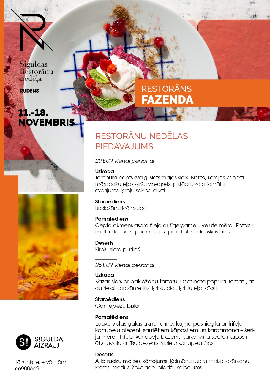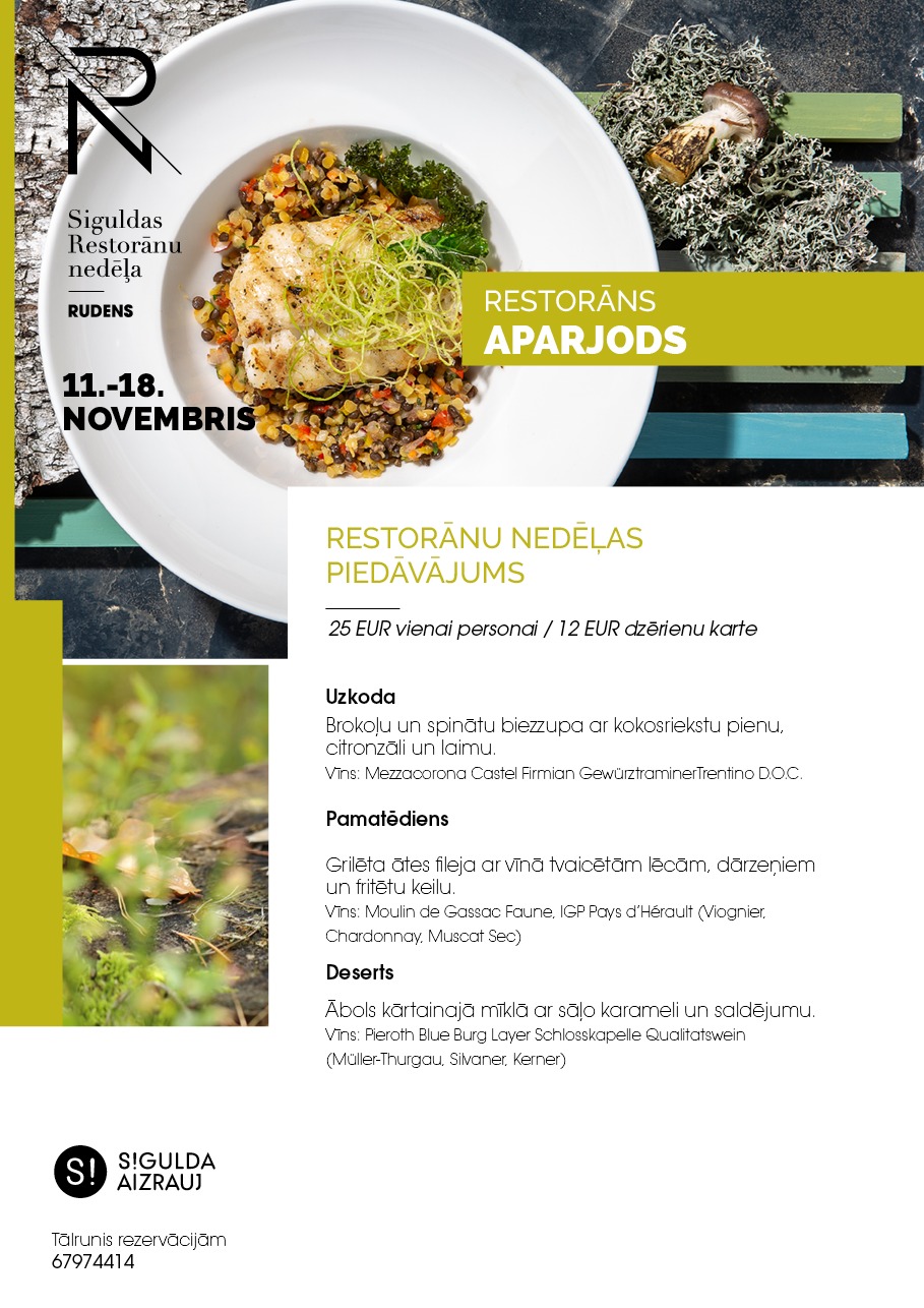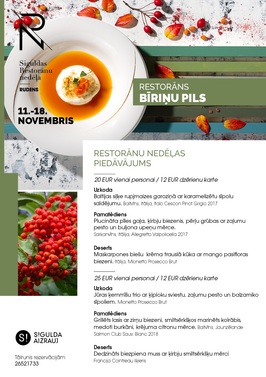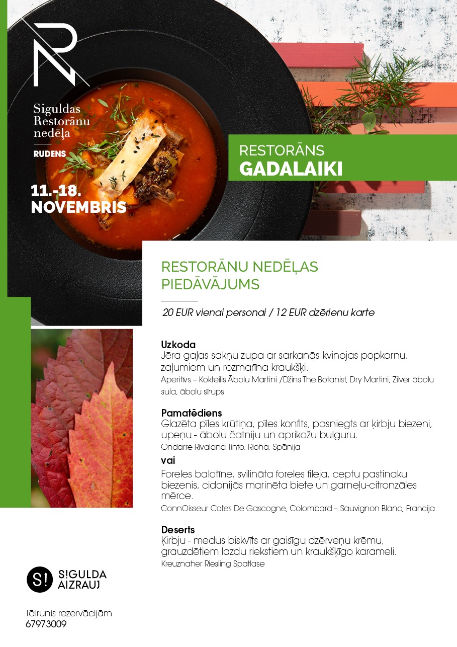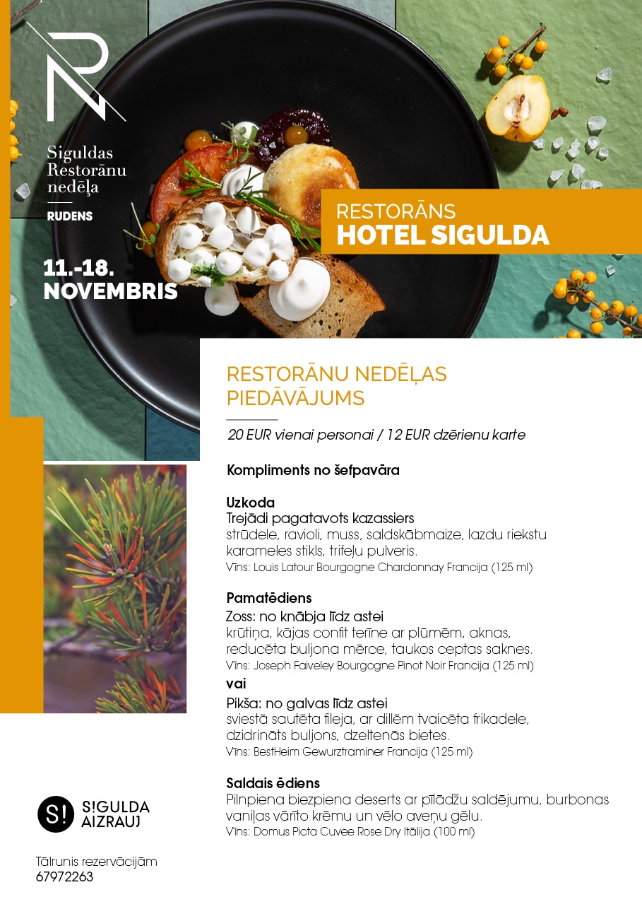 Šogad Siguldas Restorānu nedēļai izstrādāts jauns koncepts – “Piešķir krāsas rudenim”, kurā septiņu restorānu šefpavāri un ēdienu virtuozi apspēlēs rudens krāšņumu un krāsainību caur gastronomisku piedzīvojumu. Restorānu nedēļas piedāvājums būs spēkā valsts svētku nedēļas laikā no 11. līdz 18. novembrim. Siguldas Restorānu nedēļas ēdienkartes pieejamas tīmekļa vietnē www.tourism.sigulda.lv.