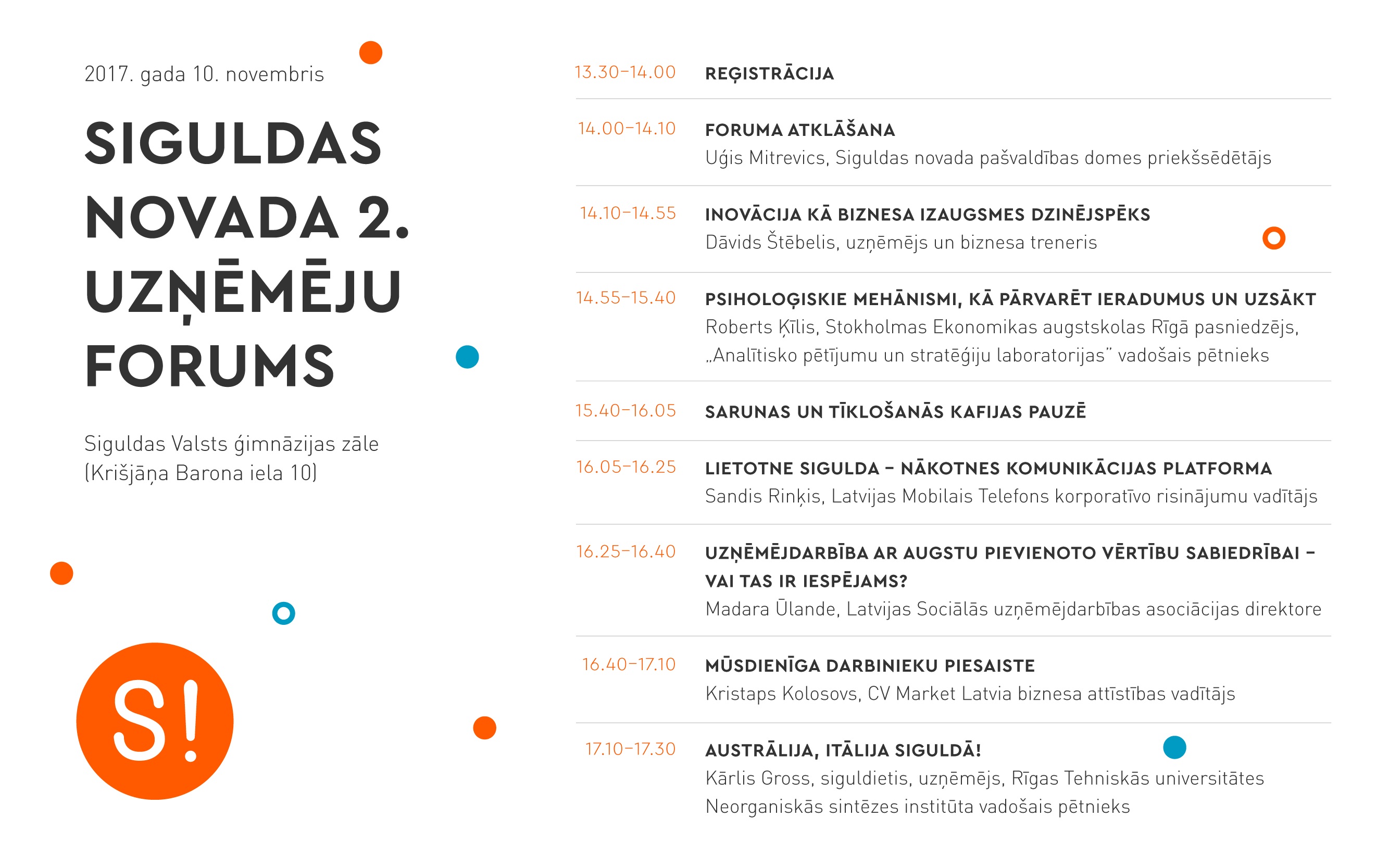Pasākumu atklās Siguldas novada pašvaldības domes priekšsēdētājs Uģis Mitrevics. Foruma lektori: uzņēmējs, biznesa treneris Dāvids Štēbelis, Stokholmas Ekonomikas augstskolas pasniedzējs Roberts Ķīlis, „Latvijas Mobilais Telefons” korporatīvo risinājumu vadītājs Sandis Rinķis, Latvijas Sociālās uzņēmējdarbības asociācijas direktore Madara Ūlande, „CV Market Latvia” biznesa attīstības vadītājs Kristaps Kolosovs, kā arī siguldietis, zinātnieks un uzņēmējs Kārlis Gross.