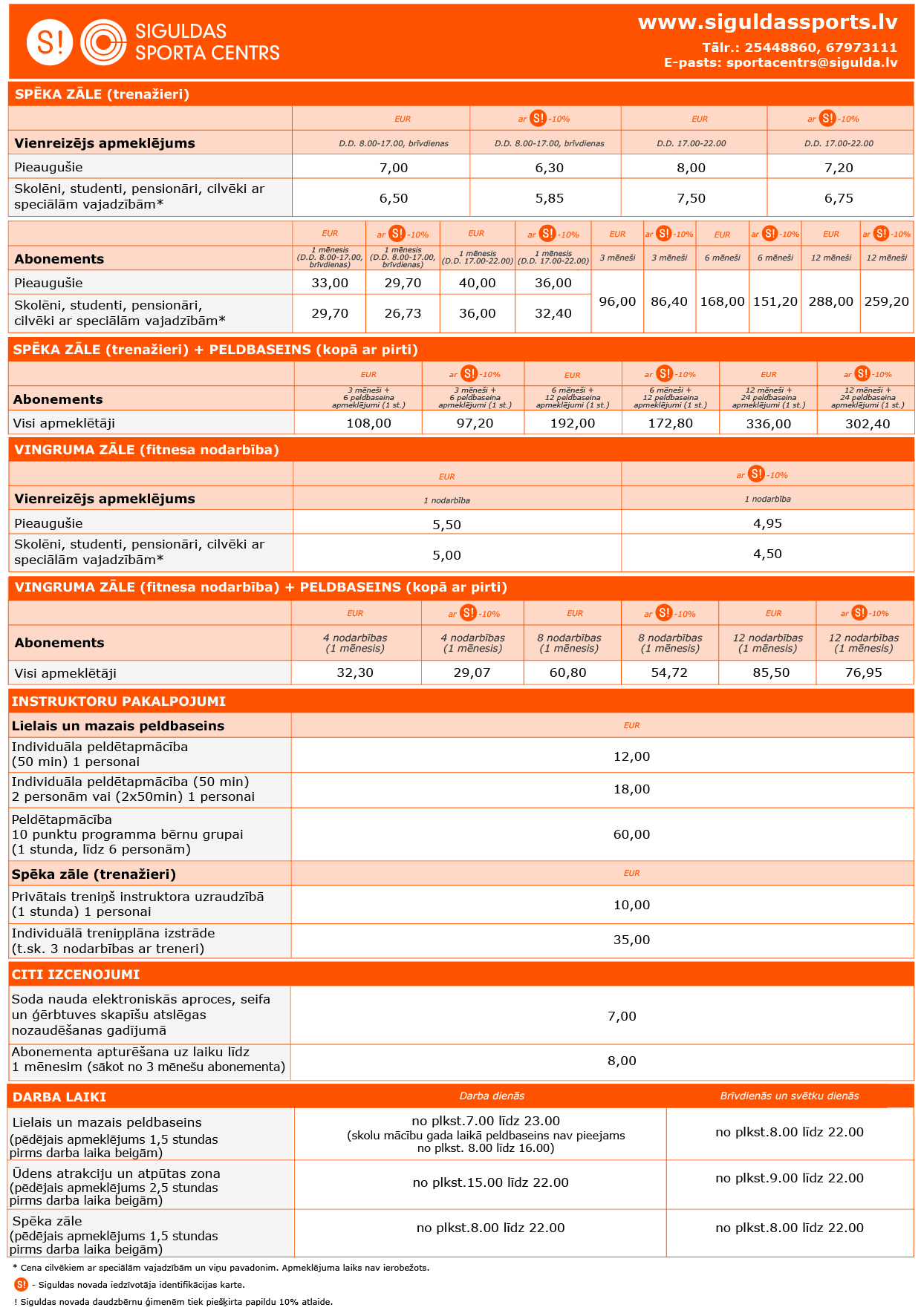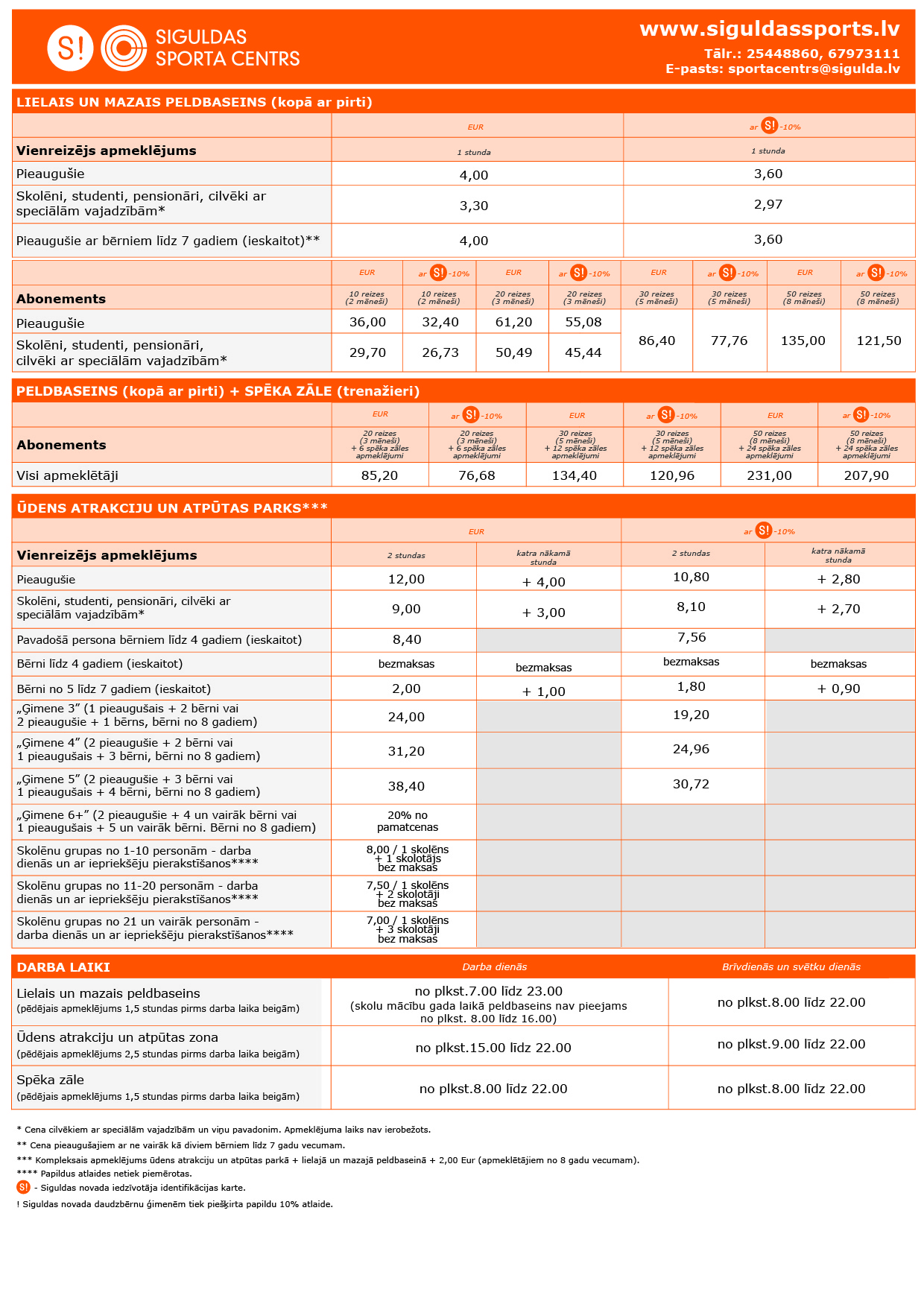 Siguldas novada iedzīvotāju ID karšu īpašniekiem. Lielajā un mazajā peldbaseinā ir ieviesti 20, 30 un 50 reižu abonementi, savukārt ūdens atrakciju un atpūtas zonā būs pieejama 30% atlaide bērnu līdz 4 gadiem pavadošajai personai, kā arī dažādi kompleksie piedāvājumi ar būtiskām atlaidēm ģimenēm, kas ūdens atrakciju un atpūtas zonu apmeklē kopā ar vairākiem bērniem. Trenažieru zālē papildu viena mēneša abonementam būs pieejami arī 3, 6 un 12 mēnešu abonementi, kurus būs iespējams iegādāties komplektā ar peldbaseina apmeklējumu. Abonements un piedāvājums pēc nodarbībām apmeklēt arī baseinu, būs pieejams arī fitnesa nodarbību apmeklētājiem.