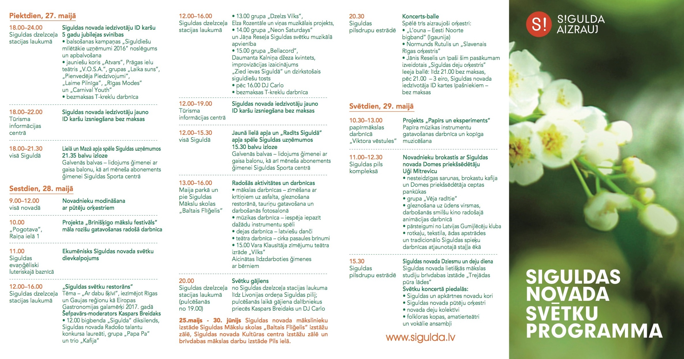 Piektdien, 27.maijā, no plkst.18.00 līdz 24.00 Siguldas dzelzceļa stacijas laukumā notiks Siguldas novada iedzīvotāja ID karšu piecu gadu jubilejas svinības, kuru laikā tiks uzsākta Siguldas novada iedzīvotāju jauno ID karšu izsniegšana bez maksas Tūrisma informācijas centrā, kas turpināsies līdz plkst.22.00. No plkst.18.00 līdz 21.30 pasākuma apmeklētāji varēs iesaistīties „Lielā apļa” un „Mazā apļa” spēlēs ar iespēju iepazīt Siguldas novada uzņēmējus un laimēt vērtīgas balvas ģimenei. Plkst.18.05 un 21.45 pārsteidzošu izrādi ļaus baudīt akrobāti no Prāgas ielu teātra „V.O.S.A. Theatre”, bet svinību muzikālo programmu veidos Siguldas novada Kultūras centra jauktais koris „Atvars” diriģenta Jāņa Baltiņa vadībā, kā arī grupas „Laime Pilnīga”, „Pienvedēja Piedzīvojumi”, „Laika Suns”, „Rīgas Modes”, bet vakara programmu noslēgs muzikālais priekšnesums no „Carnival Youth”. Vakara gaitā tiks paziņoti arī balsojuma „Siguldiešu mīlētākie uzņēmumi 2016” rezultāti. ID karšu jubilejas svinību laikā darbosies bezmaksas T‑kreklu darbnīca – ikviens aicināts ņemt līdzi savu T‑kreklu un izmantot iespēju to bez maksas apdrukāt ar Siguldas novada simboliku.