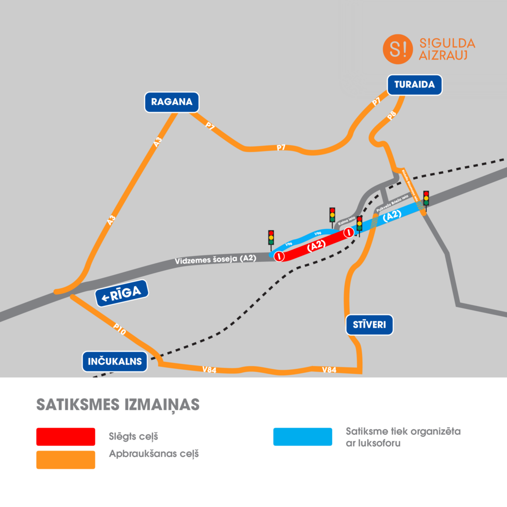 Pēc VSIA “Latvijas Valsts ceļi” pasūtījuma uz Vidzemes šosejas (A2) turpinās pārbūves darbi, tādēļ ieviesti būtiski papildu satiksmes ierobežojumi. Satiksme divos būvdarbu posmos (starp Siguldas CSDD un Pievadceļu Lorupes gravai (V96) un pie tirdzniecības centra “Šokolāde” (A2 krustojums ar Pulkveža Brieža ielu Siguldā)) tiek regulēta ar pagaidu luksoforiem un pa vienu brauktuves joslu.