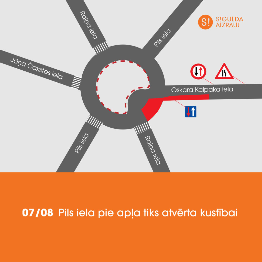 Atgādinām, ka joprojām ir slēgts Ausekļa un Raiņa ielas krustojums. Slēgto posmu iespējams apbraukt, izmantojot Pils ielu, kā arī Oskara Kalpaka un Parka ielu. Nepieciešamības gadījumā piekļuve Siguldas dzelzceļa stacijai un Siguldas novada Pašvaldības policijai ir iespējama no Parka un Rūdolfa Blaumaņa ielas puses.