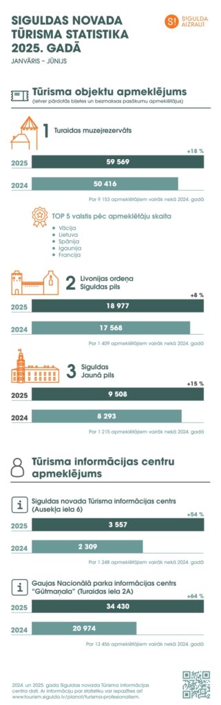 Tūristu skaita pieaugums reģistrēts arī Livonijas ordeņa Siguldas pilī, kuru no janvāra līdz jūnijam apmeklēja 18 977 apmeklētāji (+8 %), savukārt Siguldas Jauno pili 9 508 apmeklētāji, kas ir par 15 % vairāk, salīdzinot ar 2024. gadu.
