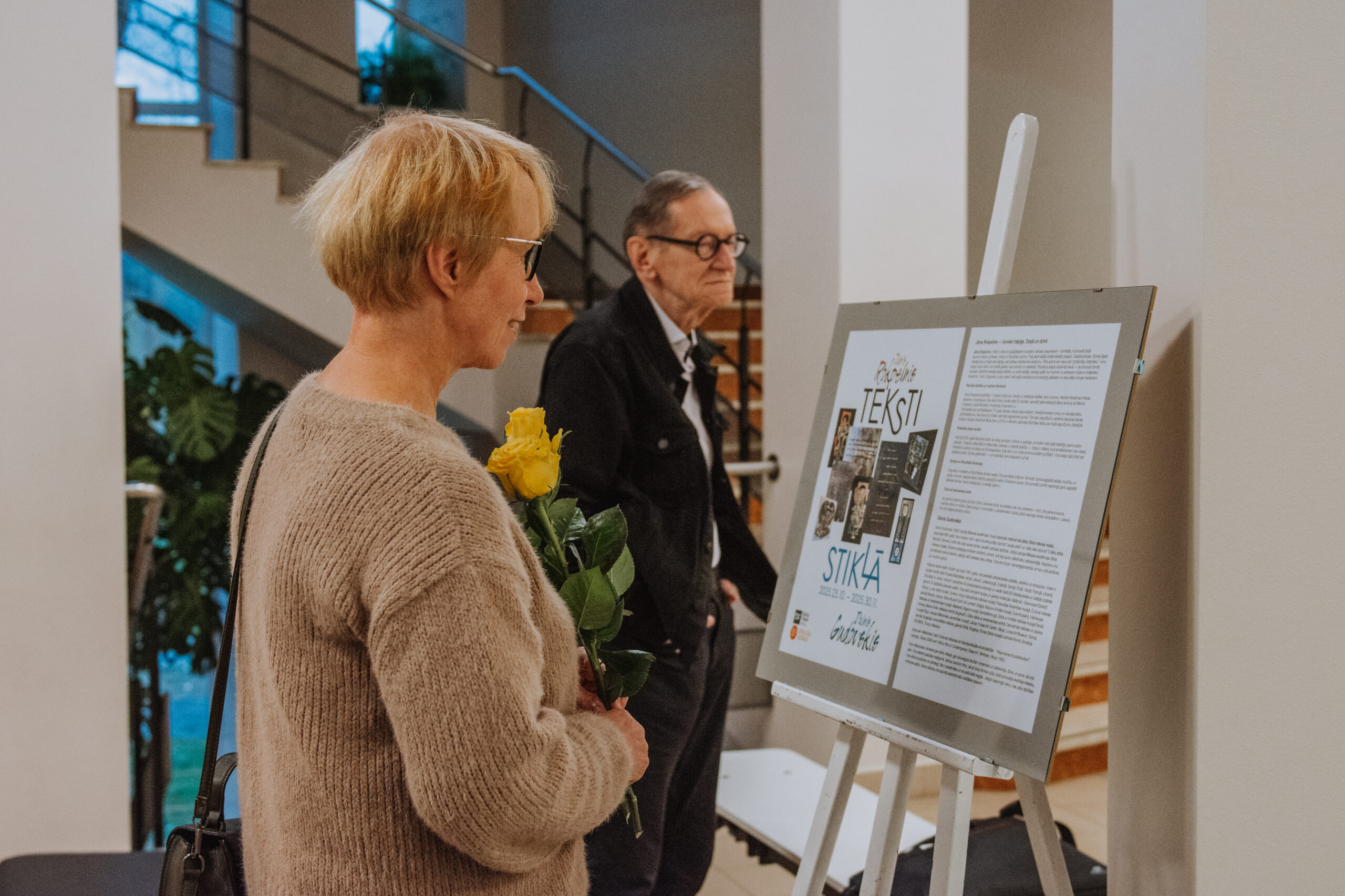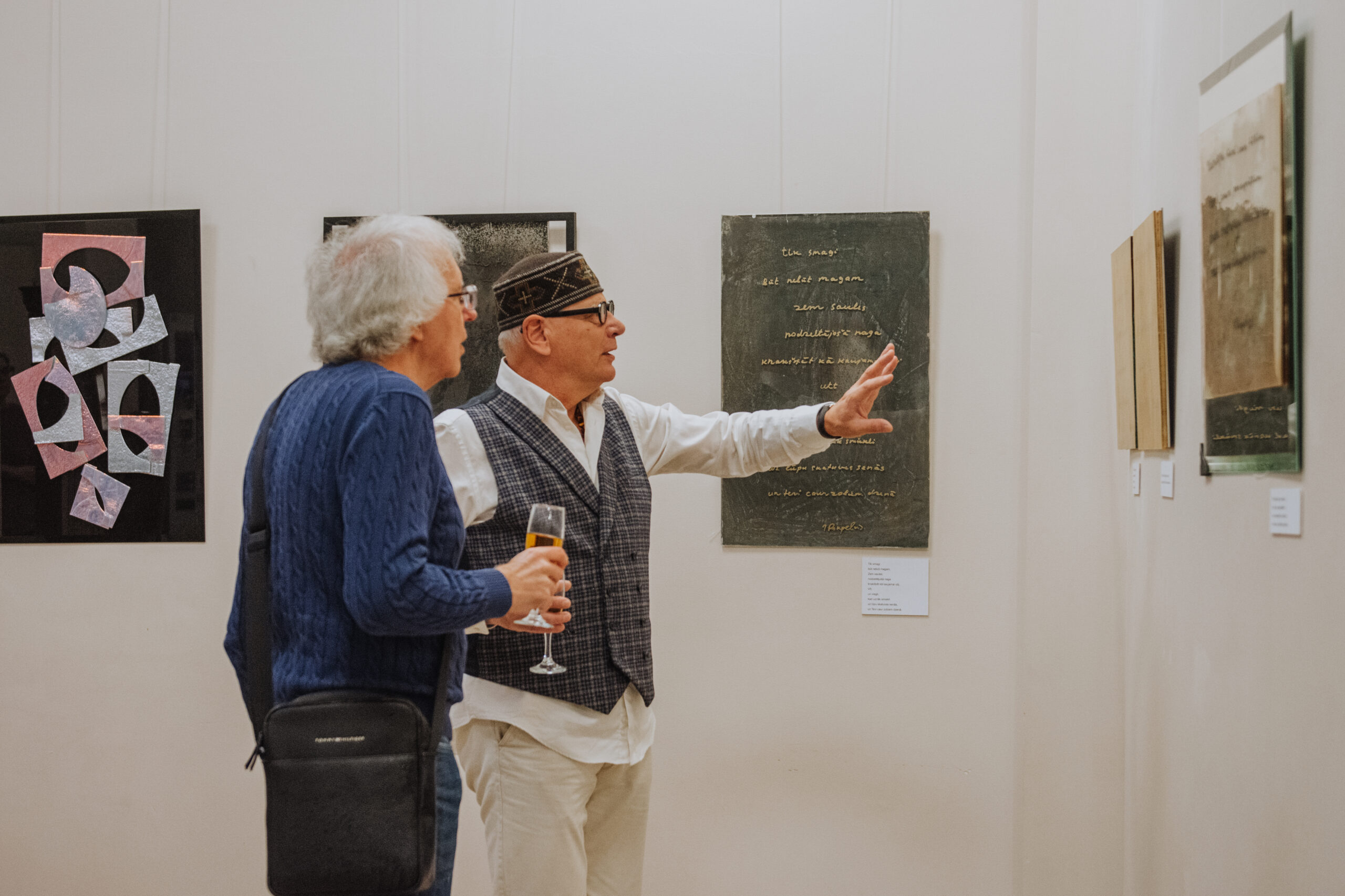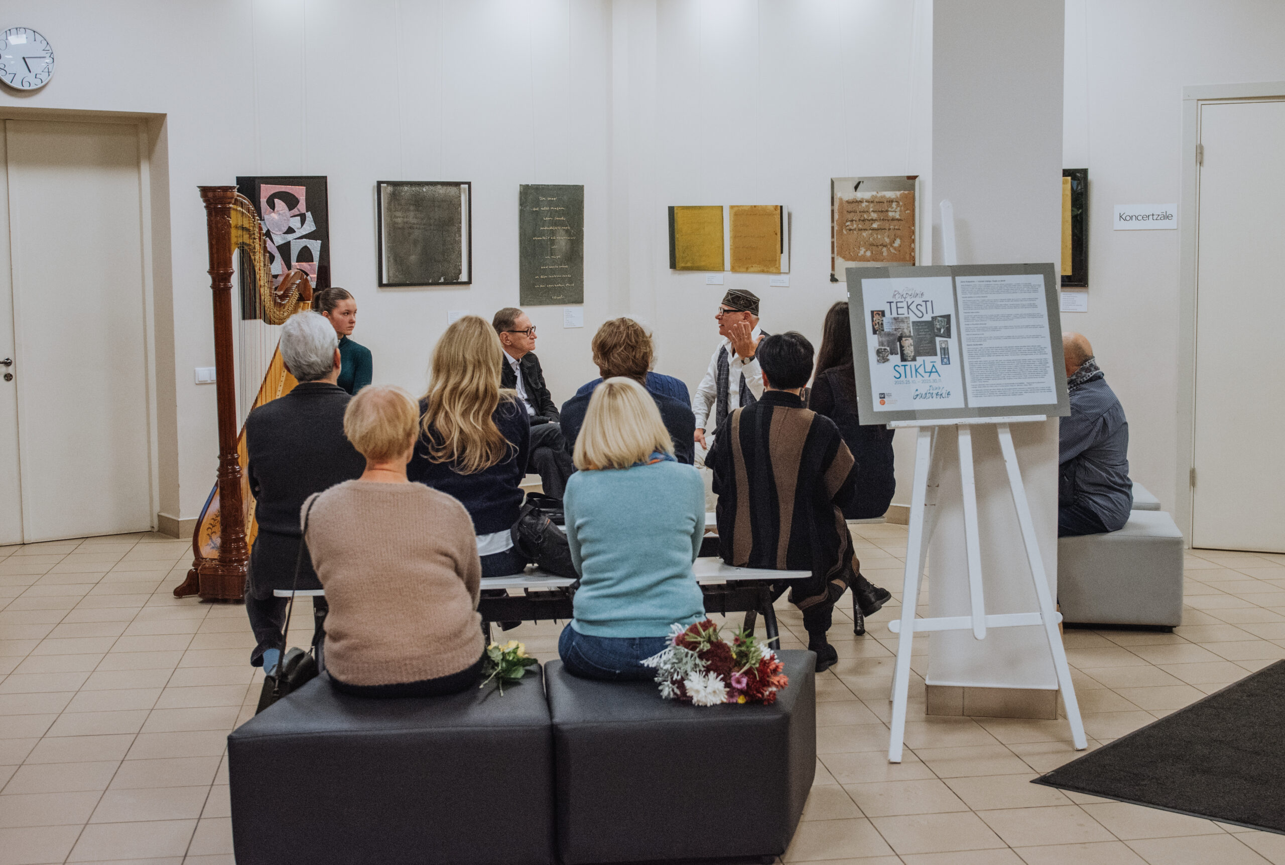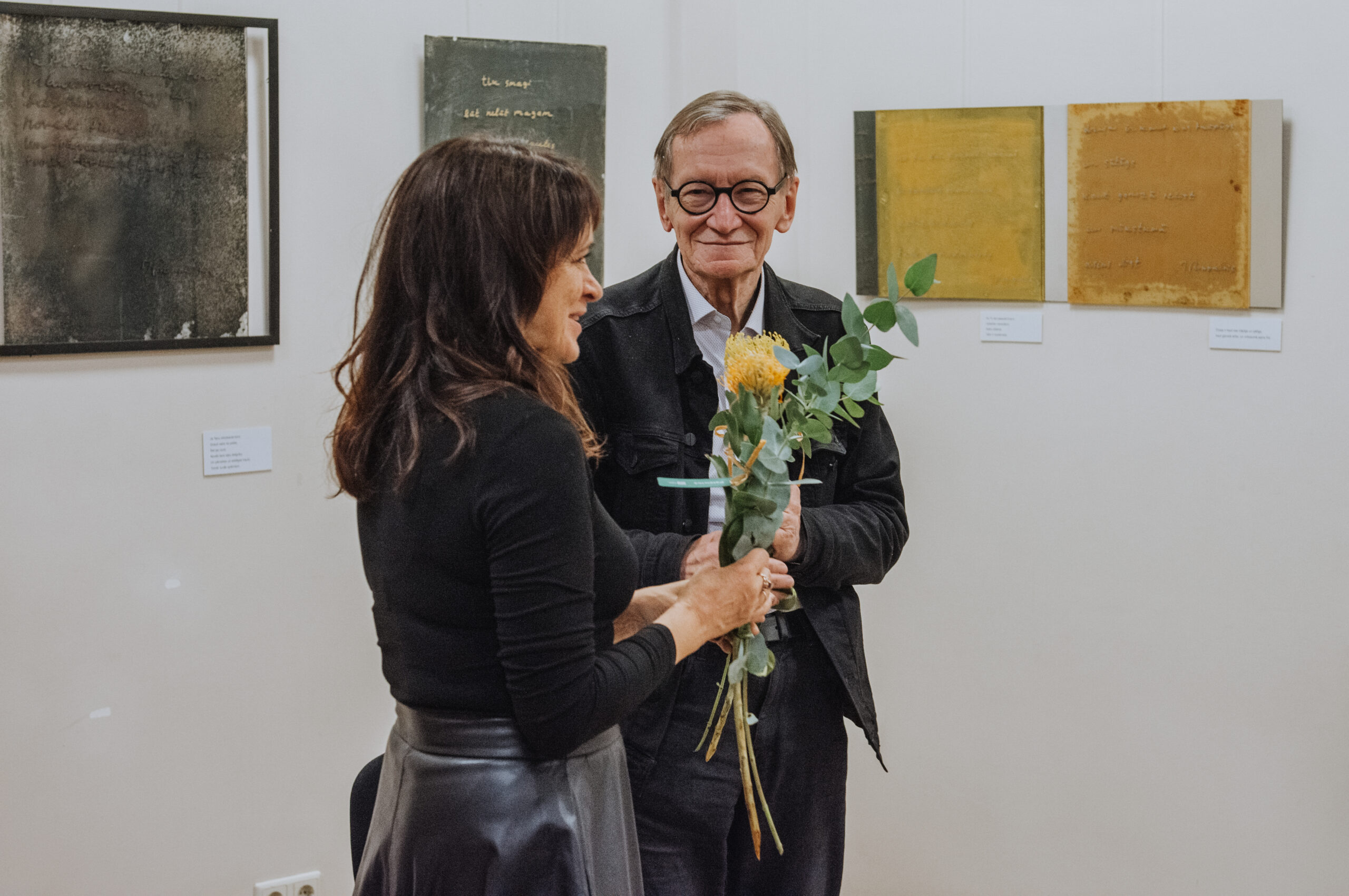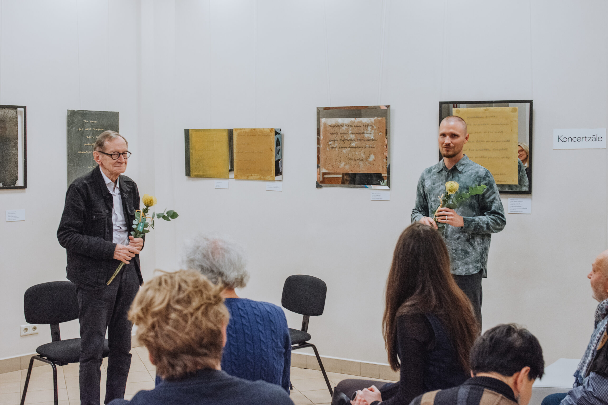 Mākslinieka Daiņa Gudovska un dzejnieka Jāņa Rokpeļņa izstādes “Teksti stiklā” atklāšana koncertzālē “Baltais flīģelis”