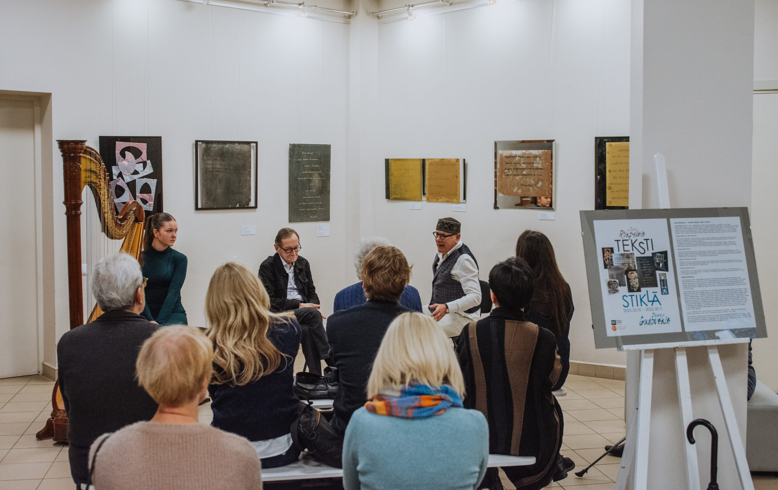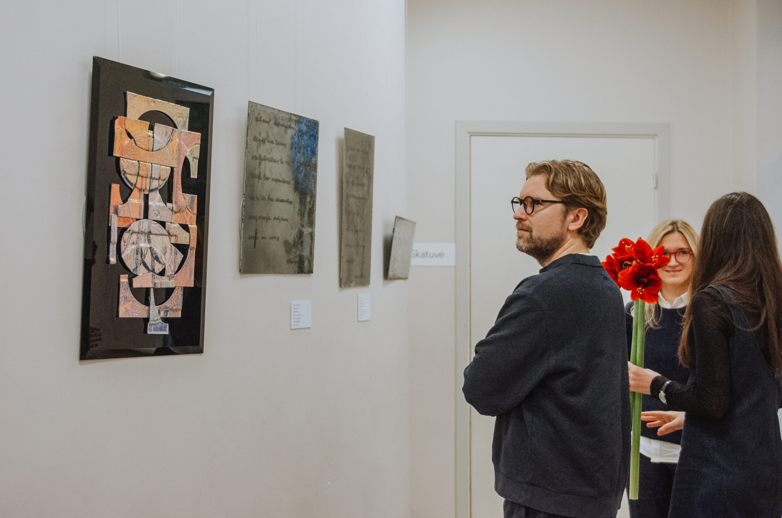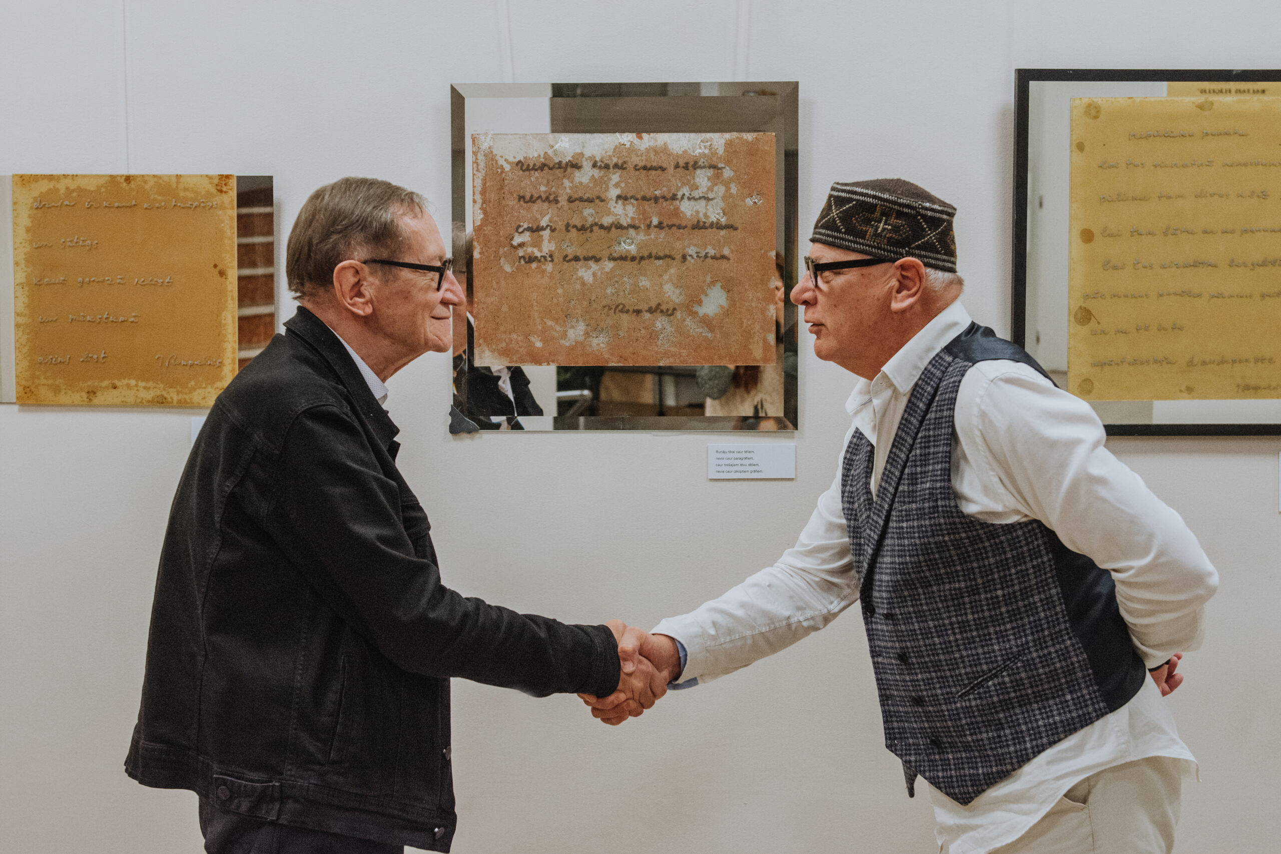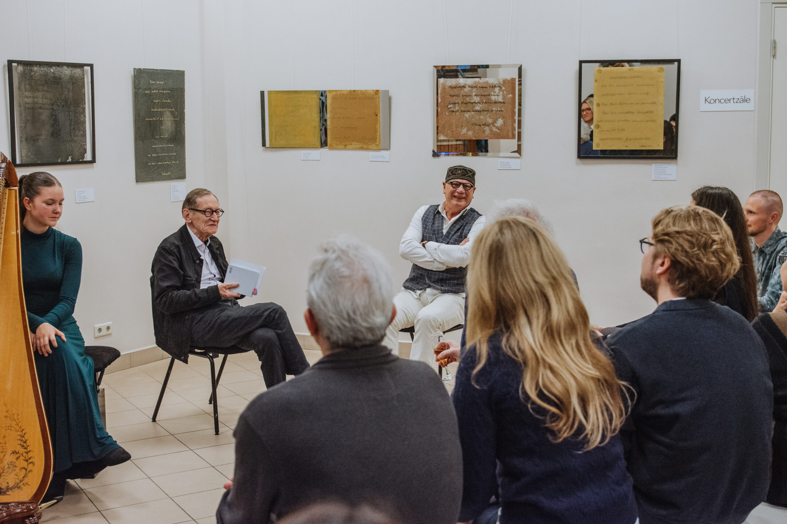 Mākslinieka Daiņa Gudovska un dzejnieka Jāņa Rokpeļņa izstādes “Teksti stiklā” atklāšana koncertzālē “Baltais flīģelis”