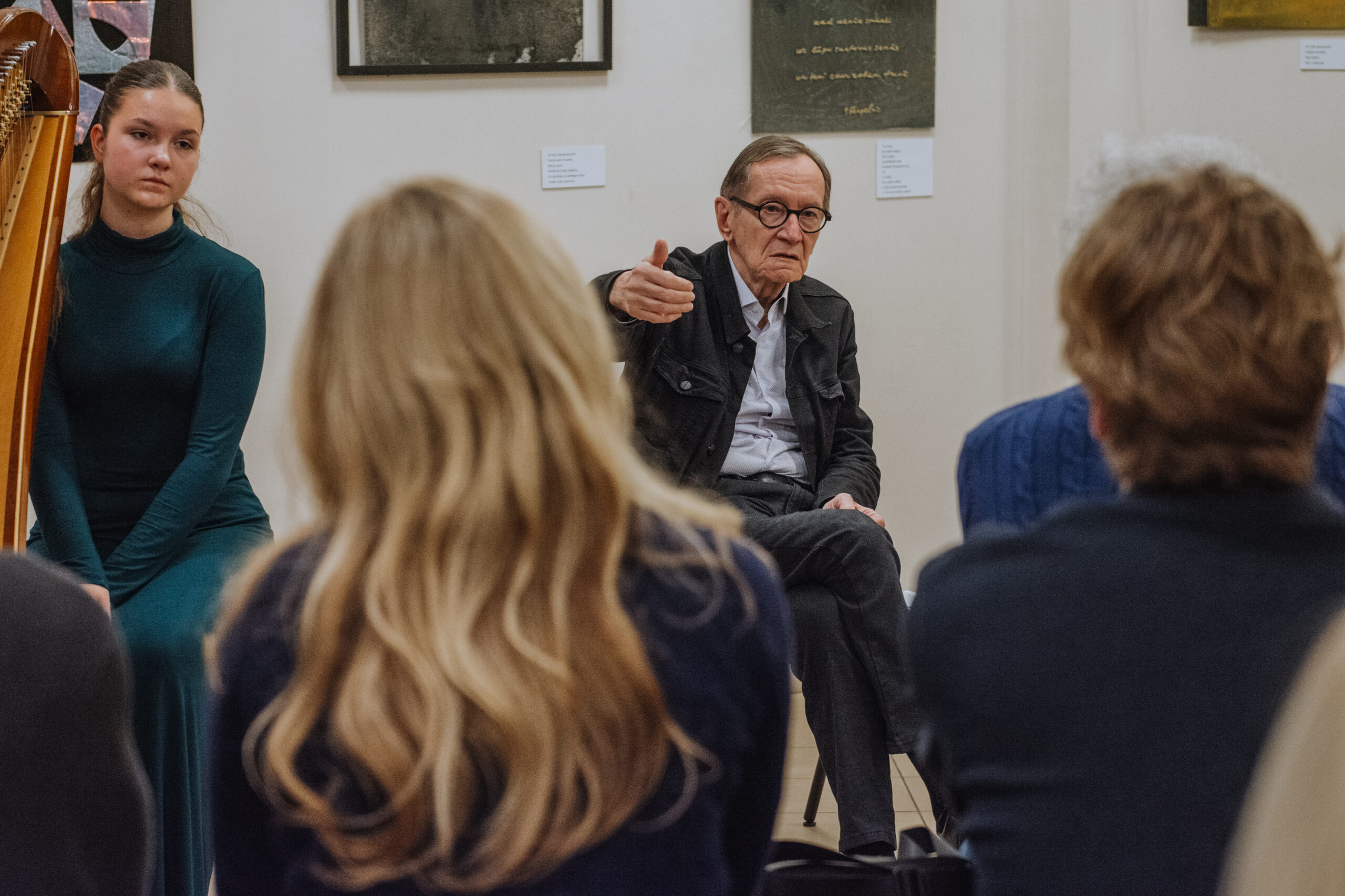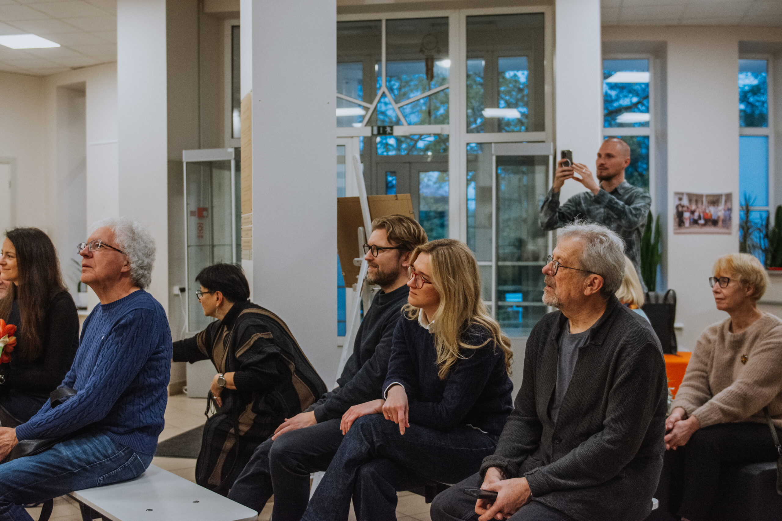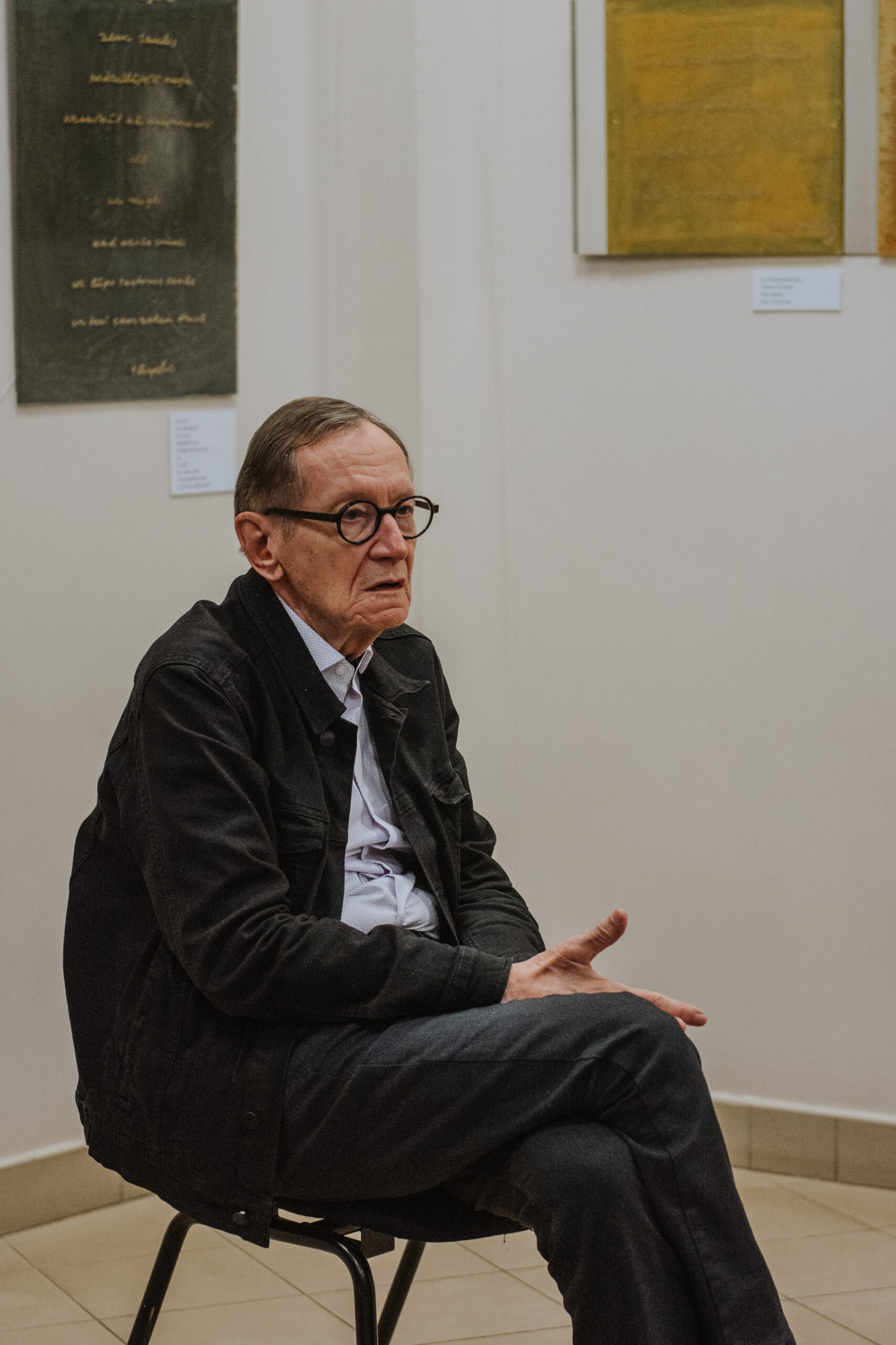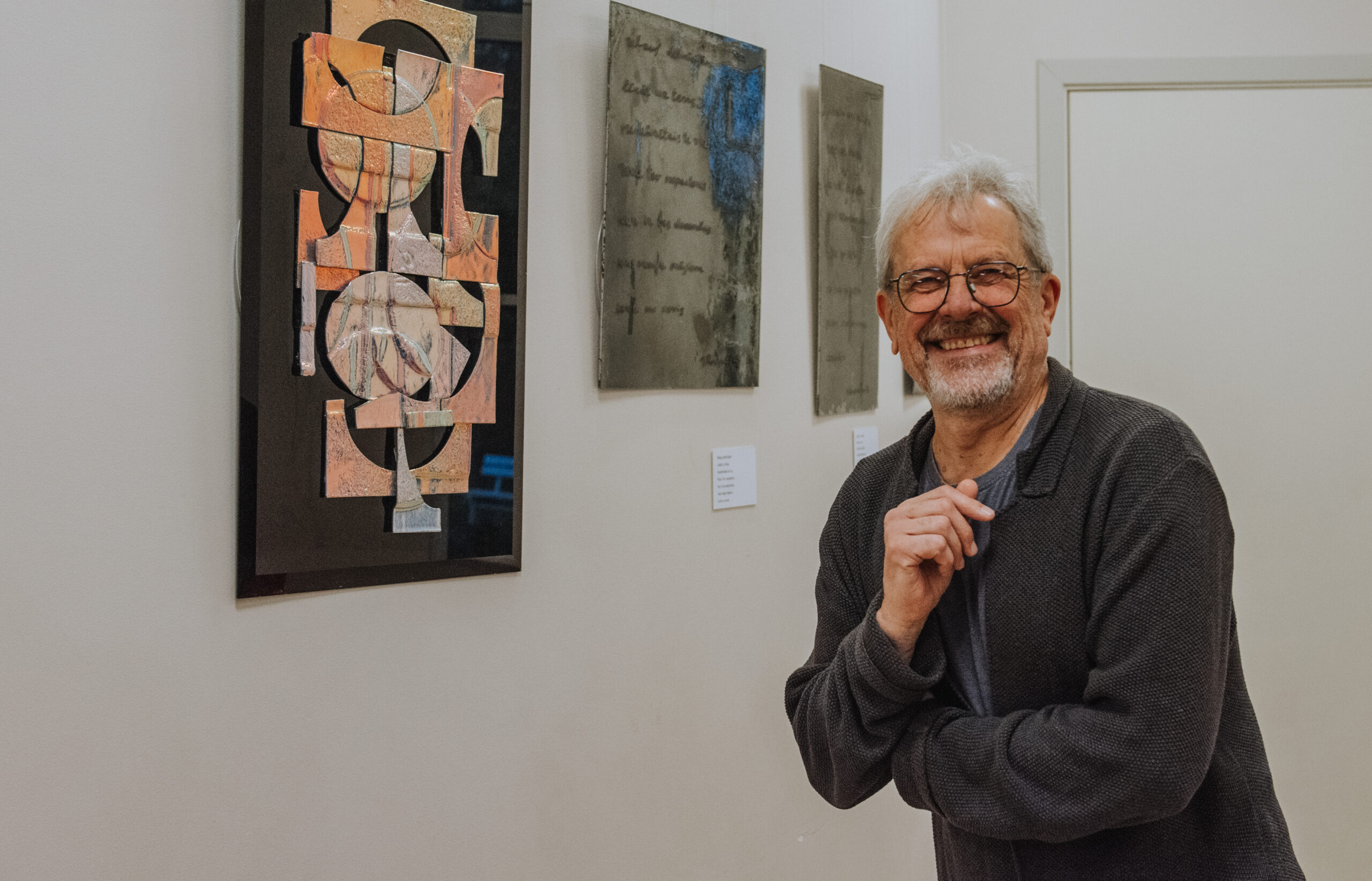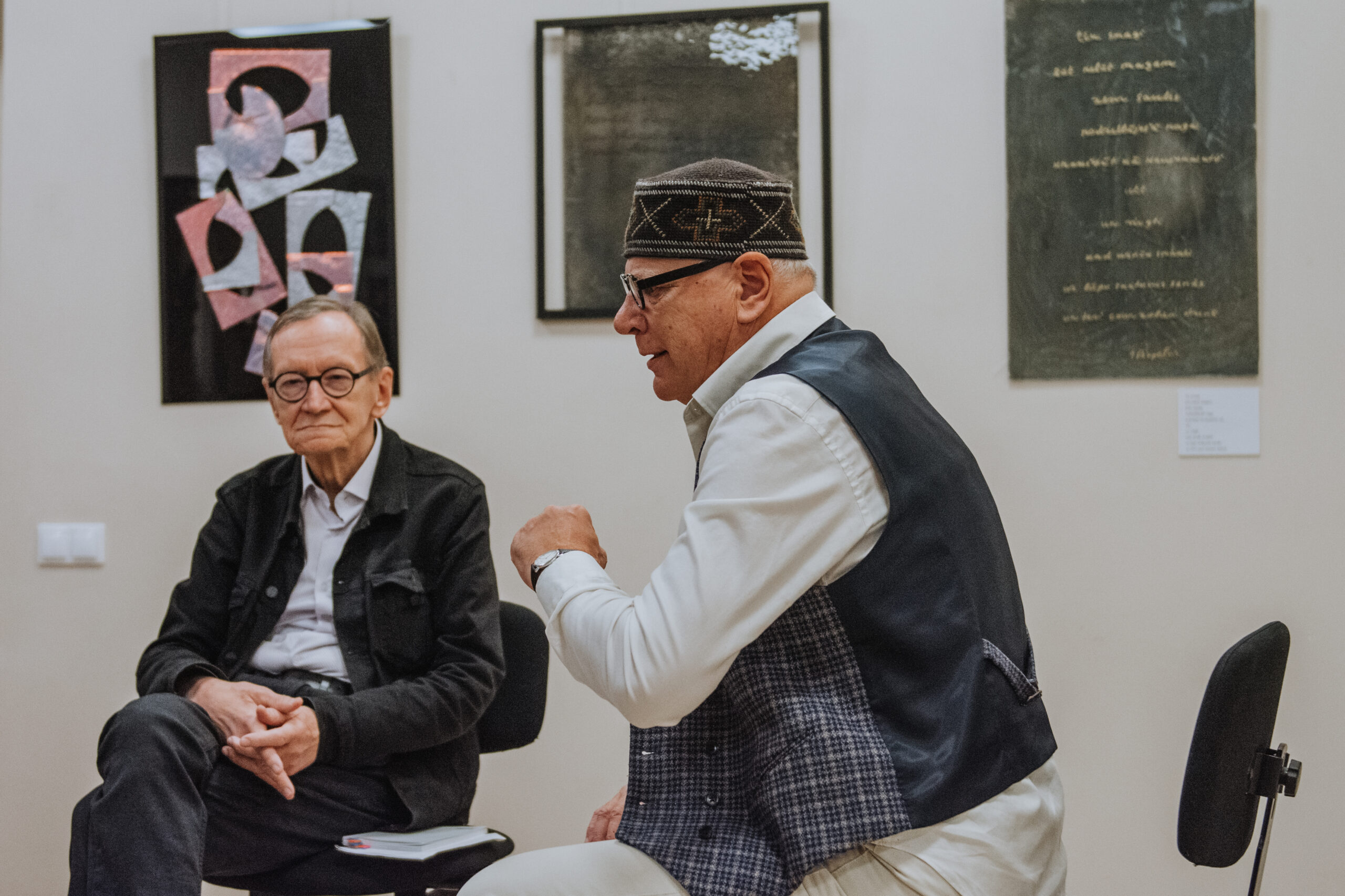 Mākslinieka Daiņa Gudovska un dzejnieka Jāņa Rokpeļņa izstādes “Teksti stiklā” atklāšana koncertzālē “Baltais flīģelis”