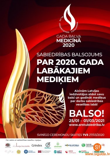 Jau 11. reizi norisināsies Latvijas veselības nozares nozīmīgākais pasākums “Gada balva medicīnā”, kurā Latvijas Ārstu biedrība aicina sabiedrību godināt veselības nozares profesionāļus. Siguldas novadnieki aicināti piedalīties balsojumā, novērtējot Siguldas novadā strādājošos mediķus, tostarp ģimenes ārstus, Siguldas slimnīcas darbiniekus. Balsot iespējams līdz 1. martam šeit.