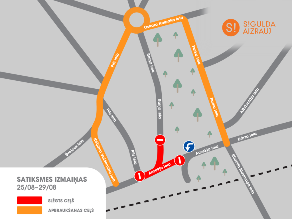 Atgādinām, ka joprojām satiksmei slēgts Ausekļa un Raiņa ielas krustojums. Slēgto posmu iespējams apbraukt, izmantojot Pils ielu, kā arī Oskara Kalpaka un Parka ielu. Piekļuve Siguldas dzelzceļa stacijai un Siguldas novada Pašvaldības policijai nepieciešamības gadījumā ir nodrošināta no Parka un Rūdolfa Blaumaņa ielas puses.
