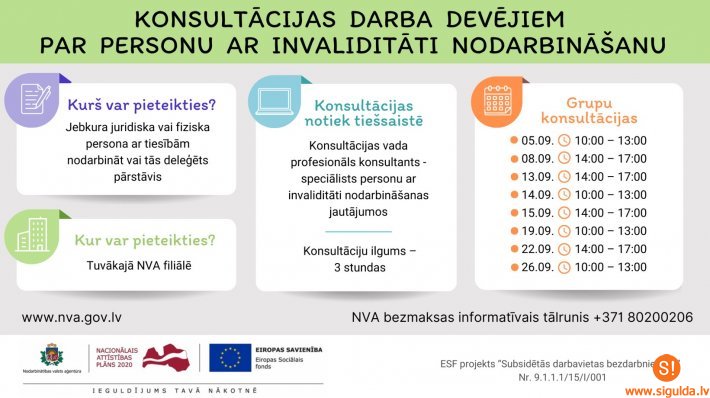 Darba devējiem, kuri nodarbina vai plāno nodarbināt darbiniekus ar invaliditāti, Nodarbinātības valsts aģentūra (NVA) septembrī rīko astoņas bezmaksas grupu konsultācijas par personu ar invaliditāti nodarbināšanas jautājumiem.