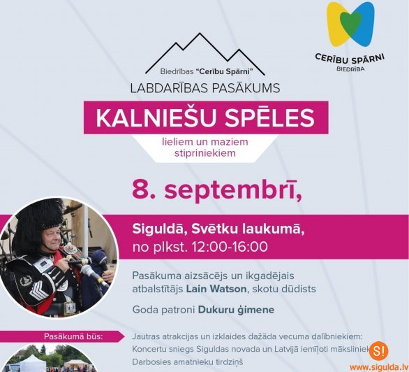 Sestdien, 8.septembrī, no plkst.12.00 līdz 16.00 Svētku laukumā norisināsies biedrības „Cerību spārni” organizēts labdarības pasākums „Kalniešu spēles”, kurā ikvienam būs iespēja piedalīties sportiskās un jautrās disciplīnās, dalības maksu ziedojot cilvēkiem ar funkcionāliem traucējumiem.