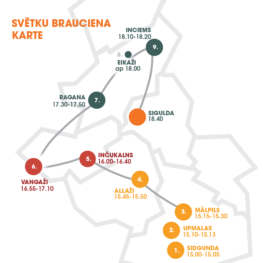 • Upmalas (plkst. 15.10–15.13). Maršruts: Lielvārdes šoseja (izbrauc cauri Upmalām);