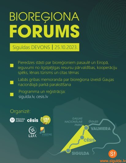 Trešdien, 25. oktobrī, kultūras centrā “Siguldas devons” no plkst. 10.00 līdz 16.00 norisināsies starptautisks forums “Misija – Bioreģiona izveide Gaujas Nacionālajā parkā”. Forumu organizē Siguldas novada pašvaldība, Cēsu novada pašvaldība, biedrība “GreenFest”, Vidzemes plānošanas reģions, Latvijas Lauku konsultāciju un izglītības centrs. Pasākums būs veltīts pirmā bioreģiona izveidošanai Latvijā – Gaujas Nacionālajā parkā, kā arī zināšanu apmaiņai un pieredzes gūšanai.