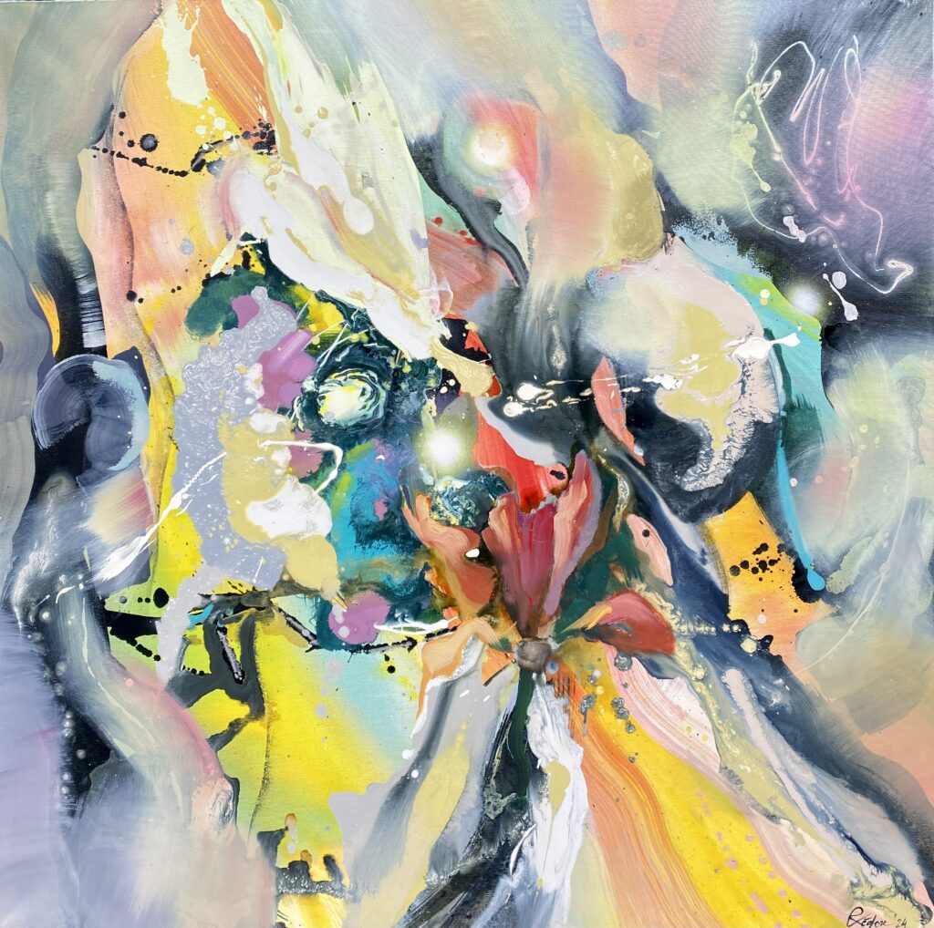 Baiba Rēdere Logina savos abstraktajos darbos pēta kustību, plūdumu un gaismas klātbūtni. Daudzslāņaini, caurspīdīgi krāsu laukumi veido telpu, kurā skatītājs tiek aicināts apstāties, ieelpot un iesaistīties mierīgā iekšējā dialogā. Šie darbi nav stāsti ar konkrētu sižetu – tie ir sajūtu nospiedumi, vizuālas meditācijas par pārmaiņām un iekšējo līdzsvaru.