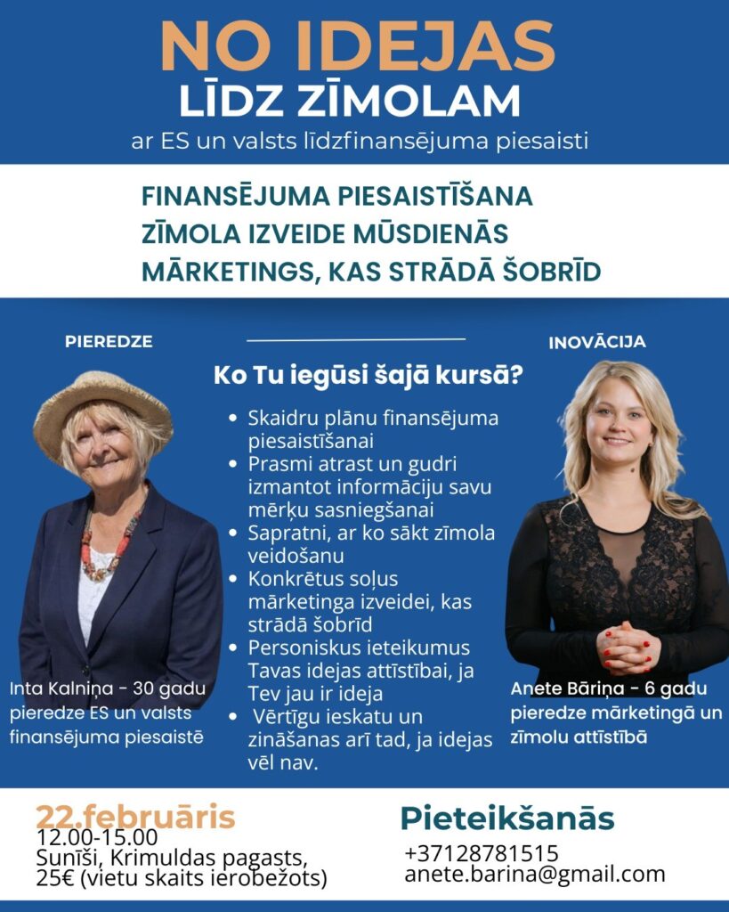 Ar pieredzi dalīsies Inta Kalniņa, kurai ir 30 gadu pieredze ES un valsts finansējuma piesaistē, kā arī Anete Bāriņa ar pieredzi mārketingā un zīmolu attīstībā.