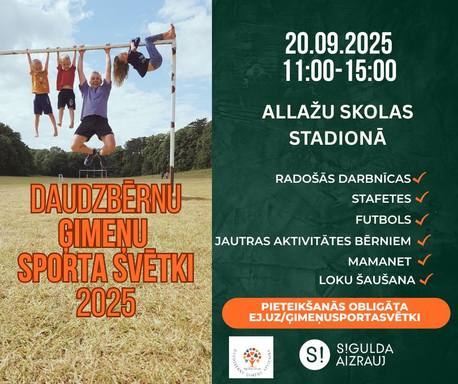 20. septembrī plkst. 11.00–15.00 Allažu skolas stadionā Daudzbērnu ģimeņu apvienība aicina ģimenes uz īpašo notikumu – “Daudzbērnu ģimeņu sporta svētkiem” –, kas veltīts aktīvai atpūtai un draudzīgai kopā būšanai.