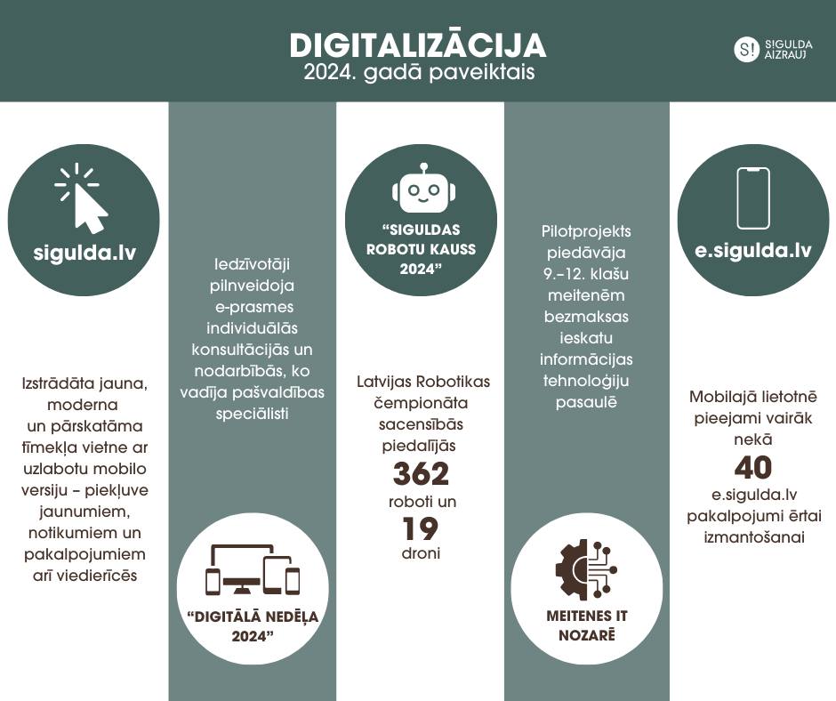 • Turpinās darbs pie pašvaldībā pieejamo pakalpojumu klāsta attīstības; elektronisko pakalpojumu portāls e.sigulda.lv nemitīgi tiek attīstīts un pašlaik portālā ir pieejami 49 e‑pakalpojumi. Papildus portālā latvija.gov.lv izveidotas 13 Siguldas novada pakalpojumu e‑formas e‑adresē.
