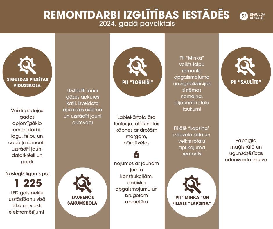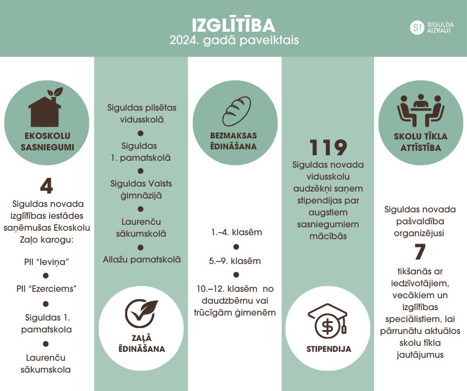 • 2024./2025. mācību gadā Siguldas novada pašvaldības pirmsskolas izglītības iestādēs un vispārizglītojošajās skolās mācības uzsākuši 5945 audzēkņi, kas ir par 73 bērniem un jauniešiem vairāk nekā pērn. Vispārizglītojošajās skolās mācās 4246 skolēni, 1. klasē – 451 bērns. Pirmsskolas izglītības iestādes apmeklē 1699 audzēkņi.
