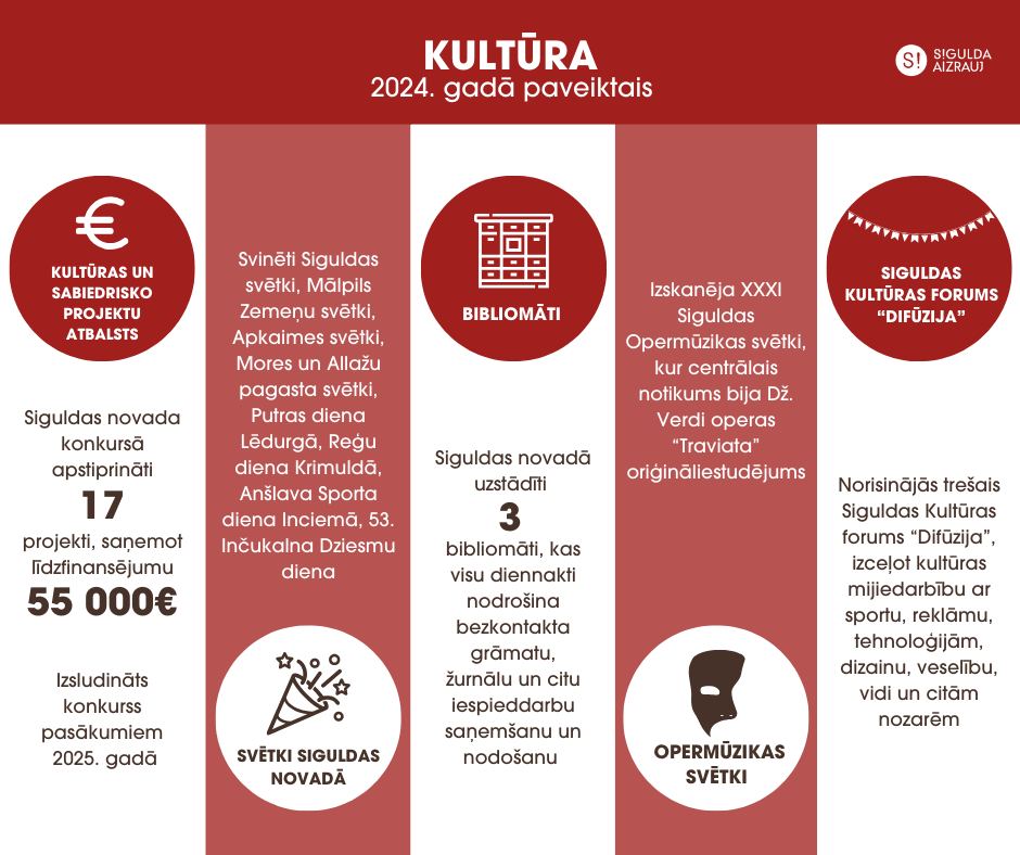 • Kultūras centrā “Siguldas devons” šogad bija skatāmas 11 izstādes, tai skaitā starptautiskā emaljas mākslas biennāles izstāde “International Biennial of Enamel Art Vilnius 2024” un Rīgas fotogrāfijas biennāles izstāde ”Lai būtu, mums jāsaprot upe/ To be we need to know the river”.