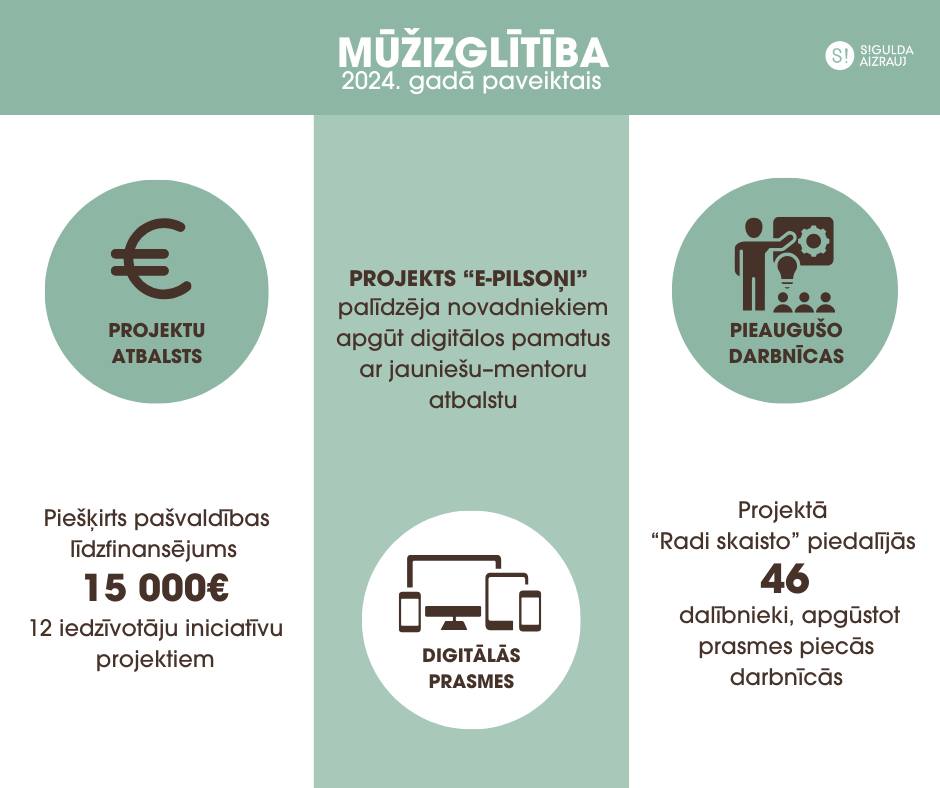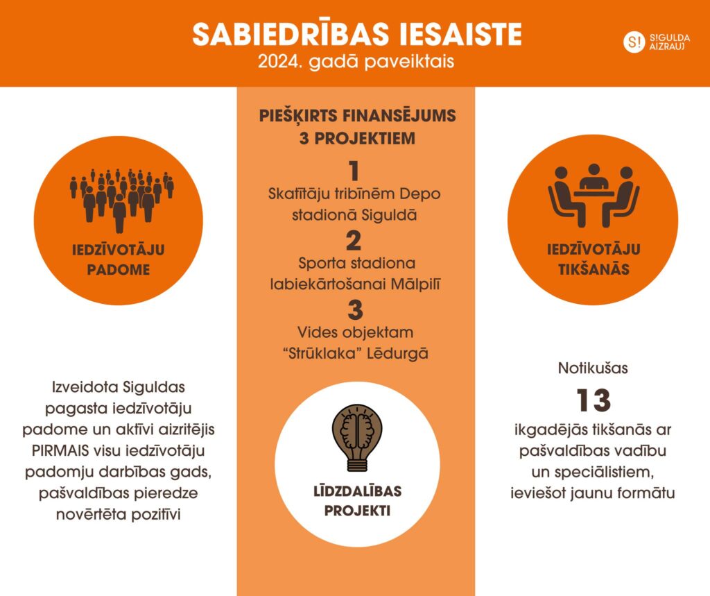 • Veicinot iedzīvotāju iesaisti novada attīstībā, pirmo reizi īstenoti līdzdalības projekti, tiem piešķirot pašvaldības budžetu. Finansējums piešķirts trim projektiem – skatītāju tribīņu būvniecībai Depo sporta laukumā Siguldā, sporta stadiona teritorijas labiekārtošanai Mālpilī, kā arī vides objektam “Strūklaka” Lēdurgas centrā. Norisinājusies arī 2025. gadā plānoto projektu pieteikšana.