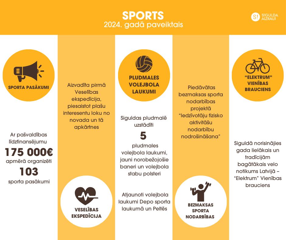 • Norisinājušās sacensības “S!-Peld 2024”, “S!-Velo 2024”, “Siguldas kauss 2024” disku golfā, pludmales volejbola sacensības “Sigulda Open”, “Raganas kauss”, “Siguldas Kauss 2024” orientēšanās sportā, “Siguldas kauss florbolā 2024”, Latvijas čempionāts šosejas riteņbraukšanā kalnā braukšanā, jāšanas sporta sacensības “Salaiņu Rudens kauss 2024”​, starptautiskas džiu-džitsu sacensības, Siguldas kalnu maratons un citas sacensības, pārstāvot plašu sporta veidu spektru.