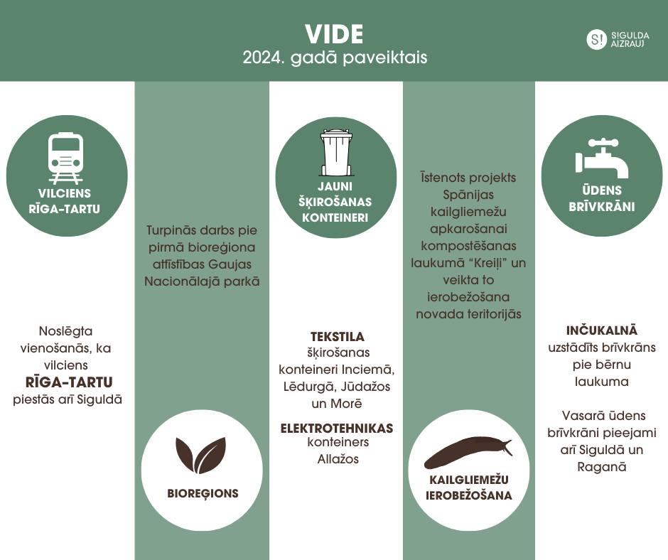 • Sadarbībā ar Siguldas novada atkritumu apsaimniekotājiem – Siguldas pilsētas SIA “JUMIS”, pašvaldību SIA “ZAAO” un SIA “Clean‑R” – īstenotas dažādas atkritumu nodošanas akcijas, kurās novada iedzīvotājiem bija iespēja nodot automašīnu riepas, lielgabarīta atkritumus, elektroniku, zaļos un dārza atkritumus un citus atkritumu veidus.