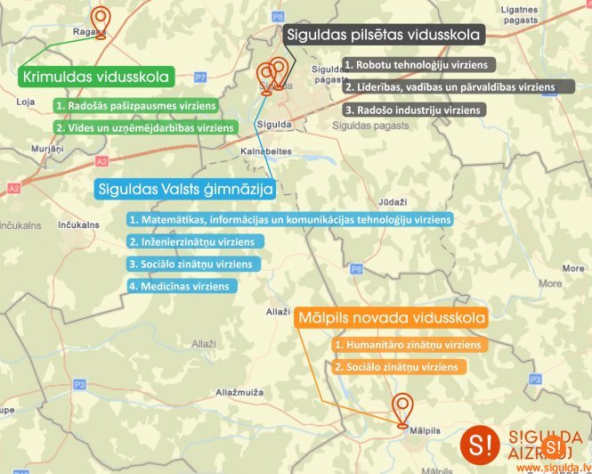 - Siguldas Valsts ģimnāzijā – Matemātikas, informācijas un komunikācijas tehnoloģijas; Inženierzinātnes; Sociālās zinātnes; Medicīna