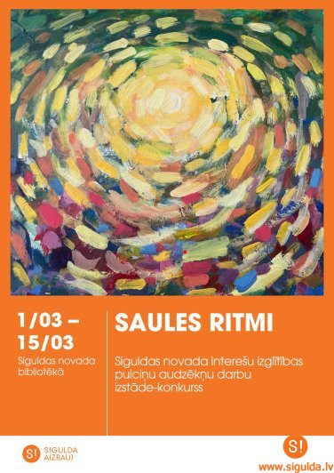 Bērnu un jauniešu vizuālās un vizuāli plastiskās mākslas izstāde-konkurss “Saules ritmi” ir Valsts izglītības satura centra rīkotā konkursa 1. kārta. Pēc darbu izvērtēšanas, veiksmīgākie no tiem tiks izvirzīti konkursa II kārtai, kas notiks 27. martā Cesvaines pilī. Izstādē apskatāmi vairāk nekā piecdesmit interešu izglītības mākslas pulciņu audzēkņu darbi no Siguldas novada Jaunrades centra, Allažu pamatskolas, Inčukalna pamatskolas, Garlība Merķeļa Lēdurgas pamatskolas, Laurenču sākumskolas, Siguldas pilsētas vidusskolas, Maijas Pīlāgas Lēdurgas mākslas skolas, Mālpils Mūzikas un mākslas skolas, Mālpils Kultūras centra un Siguldas mākslu skolas “Baltais Flīģelis”.