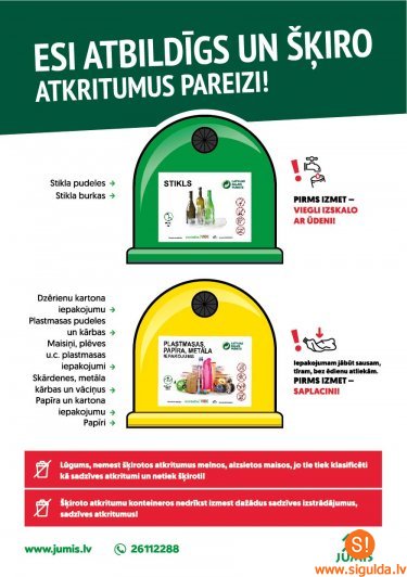 Siguldas novadā iedzīvotājiem pieejami zaļas krāsas zvana veida konteineri, kuri paredzēti dzērienu stikla pudeļu un burku ievietošanai, kā arī dzeltenas zvana veida un parastās, kantainās tvertnes plastmasas, papīra un metāla iepakojumam. Dzeltenajā konteinerā drīkst izmest PET pudeles, šampūnu, dušas želeju un citas līdzīgas plastmasas pudeles, plastikāta maisiņus, konservu bundžas, dzērienu metāla bundžas un citus iepakojumus, kā arī visa vieda papīra un kartona iepakojumus, tai skaitā kartona kastes, arī tetrapakas, avīzes, žurnālus, brošūras, katalogus un citus reklāmas materiālus, kas nav laminēti. Šai konteinerā nedrīkst izmest netīrus iepakojumus, eļļas pudeles, rotaļlietas, slapju vai netīru papīru un kartonu, salvetes un kabatlakatiņus, kā arī vienreizlietojamos traukus. Atgādinām, ka pirms izmešanas nododamajam materiālam jābūt pēc iespējas tīram no ēdienu un dzērienu paliekām, kā arī saplacinātam.