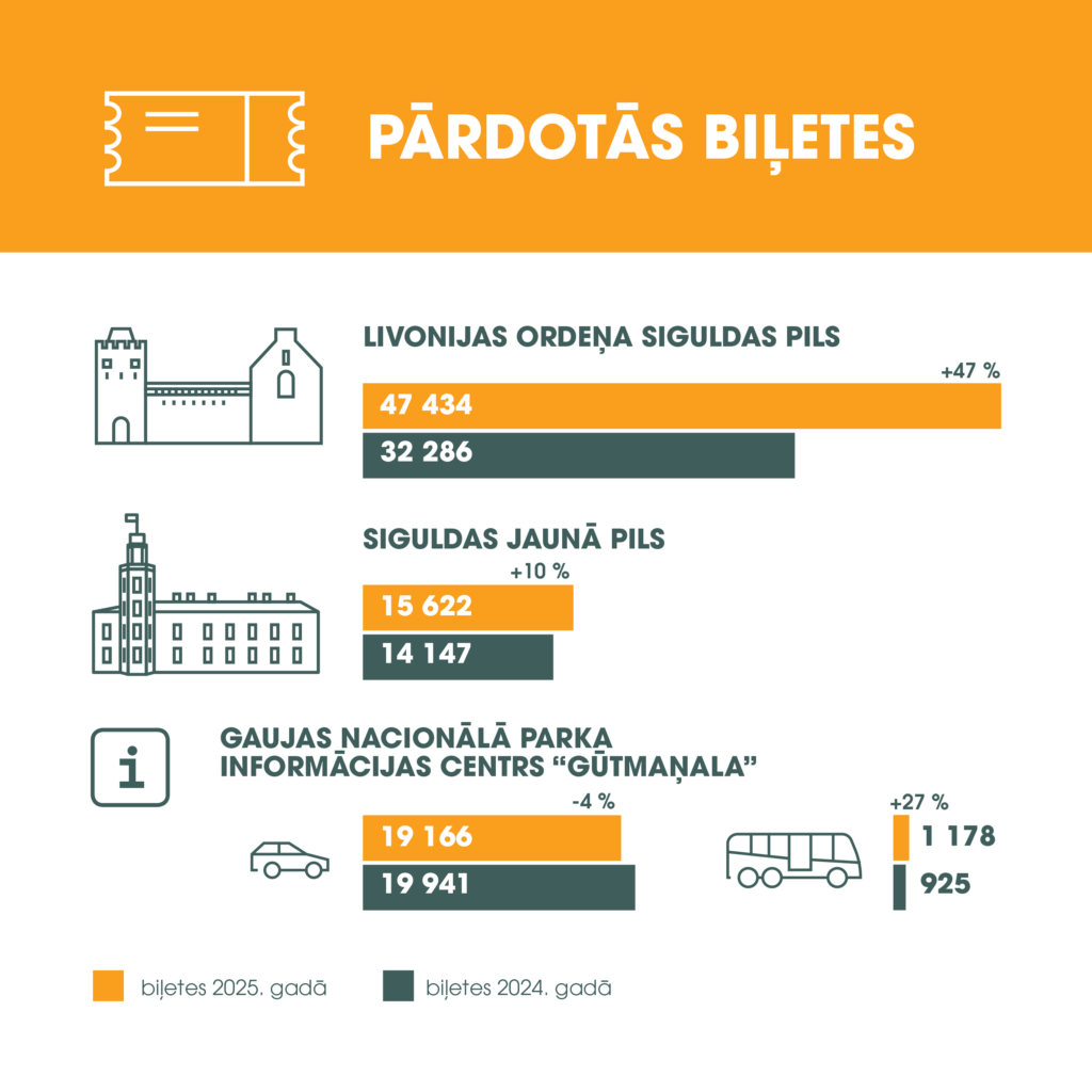 Gaujas Nacionālā parka tūrisma informācijas centrā “Gūtmaņala” pērn reģistrēts par 27 % vairāk autobusu, savukārt par 4 % mazāk automašīnu, salīdzinot ar 2024. gadu. Savukārt Siguldas Jaunajā pilī pārdotas par 10 % vairāk biļešu nekā 2024. gadā un Livonijas ordeņa Siguldas pilī par 47 % vairāk, apliecinot, ka interese par tūrisma objektiem augusi tieši grupu tūristu kategorijā. Papildu apmeklētāju pieplūdumu veicinājuši arī pasākumi – Muzeju nakts un Leģendu nakts, kuri pērn Siguldas pils kvartālā norisinājās pirmo reizi.