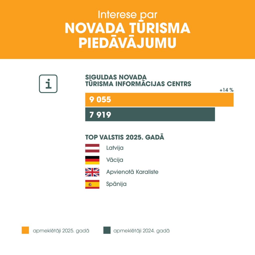 2025. gads Siguldas novada tūrisma nozarē iezīmējies ar ārvalstu viesu pieaugumu. Lai arī  kopējais apkalpoto viesu skaits tūristu mītnēs ir nedaudz samazinājies par 4,4 % (2025. gadā – 61 784 personas, savukārt 2024. gadā – 64 653 personas), iezīmējās skaidra un noturīga tendence – ārvalstu tūristu interese par Siguldu ir augusi par 9,6 % (2025. gadā Siguldas novada tūristu mītnēs viesojušies 29 112 ārvalstnieki, 2024. gadā – 26 559), liecina Centrālās statistikas pārvaldes dati, kas apkopoti no tūrisma nozares pārstāvju sniegtās ikmēneša informācijas par tūristu mītņu darbību.
