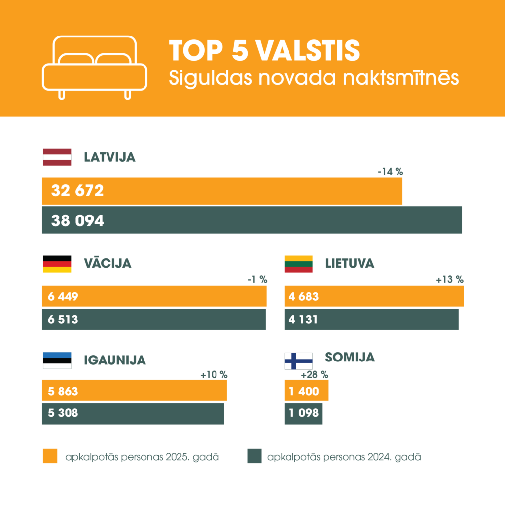 Lai gan vietējo viesu nakšņošanas skaits Siguldas novada tūrisma mītnēs pērn ir samazinājies, ārvalstu viesi 2025. gadā novada tūristu mītnēs pavadījuši 47 411 naktis, kas ir par 6,85 % vairāk nekā 2024. gadā. Tas norāda uz veiksmīgu reģiona pozicionēšanu starptautiskajā tūrisma tirgū. TOP 5 valstis, kas pēc apkalpoto viesu skaita 2025. gadā Siguldas novada tūrisma mītnēs pavadījušas visvairāk nakšu: