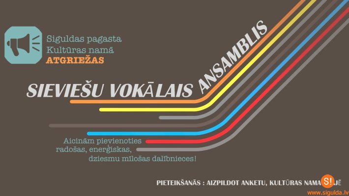 Pēc ilgāka laika pārtraukuma Siguldas pagasta Kultūras namā atgriežas sieviešu vokālais ansamblis. Ansamblis aicina pulkā radošus, enerģiskus un dziedāt gribošus dalībniekus!