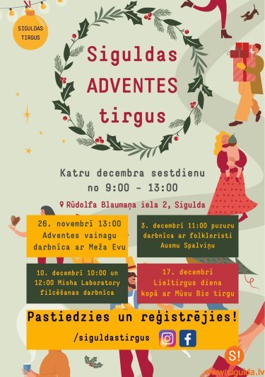 Jau šo sestdien, 3. decembrī, notiks Siguldas Adventes tirgus atklāšana. No plkst. 9.00 līdz 13.00 ikviens interesents ir gaidīts Siguldas tirgū Rūdolfa Blaumaņa ielā 2 izbaudīt Ziemassvētku tuvošanās laiku svētku gaisotnē un iepazīt vairāk nekā 50 Latvijas ražotāju un amatnieku veikumu vienuviet. Turklāt plkst. 11.00 Siguldas “Ezītis Miglā” telpās var izveidot īstenu saulgriežu mājas rotājumu – puzuru – meistarklasē kopā ar folkloristi Ausmu Spalviņu.