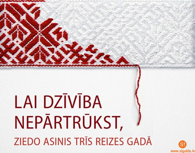 Ar atgādinājumu, ka mēs visi esam saistīti un kādu dienu asinis var vajadzēt jebkuram no mums, Valsts asinsdonoru centrs uzsāk informatīvu kampaņu „Mums ir viena asinsrite”. Latvijā asinis regulāri ziedo tikai 1,7% no iedzīvotājiem, kas var būt donori. Kampaņas mērķis ir piesaistīt jaunus donorus un mainīt esošo donoru ieradumus, aicinot cilvēkus ziedot asinis regulāri, tai skaitā atvaļinājumu un garo brīvdienu laikā.